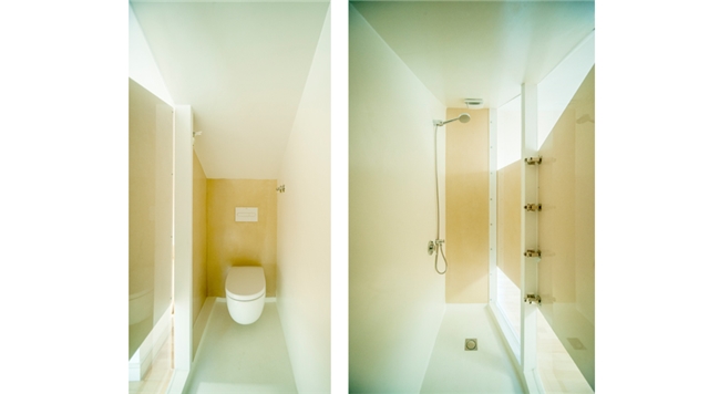 Estas dos estrategias se emplean para construir una pieza, mueble o estuche de las actividades de concentración en el estudio y de baño, que convierten un trastero situado en la planta superior abuhardillada de una vivienda, en una habitación donde sentirse cobijado durante el sueño nocturno y el descanso diurno, y aumentan las cualidades y matices del espacio a doble altura que invade.