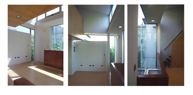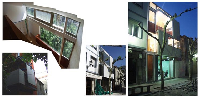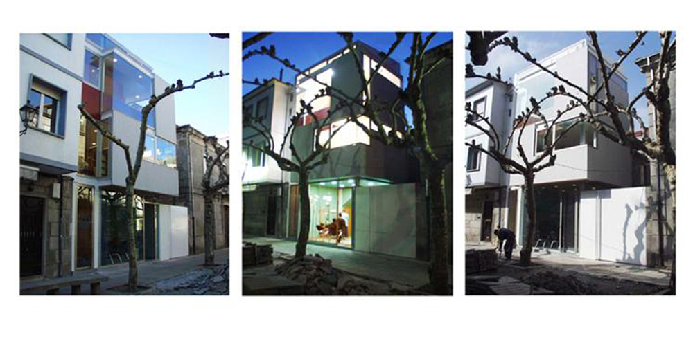 El escaso tamaño de la parcela ha requerido que los espacios diáfanos se sucedan y se produzca una fragmentación en altura del edificio a la vez que una mínima expresión de cerramiento y estructura, usando para ello materiales puros y tradicionales del entorno, estructura de acero y granito gris piñor.