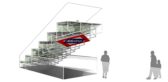 Nuevos lugares de estancia para descansar, leer, compartir, quedar... sin ocupar espacio del viandante. Cubrición de la boca del metro mejorando su uso y visualización.