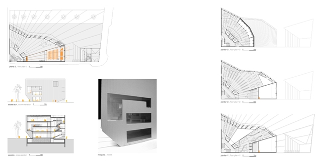 El edificio se conforma como una estructura densa de pantallas de madera contralaminada horadadas, envuelta por láminas plegadas de acero corten que, enlazadas, conforman un sólido poroso de múltiples secuencias interiores y paisajes exteriores. Por fuera, el volumen organiza una transición entre la edificación de cuatro plantas circundante y el espacio abierto del parque de Félix López, liberando espacio para una plaza hacia la que la arquitectura se presenta como un interfaz abierto y legible. El paisaje de láminas plegadas es elocuente sobre su uso de forma sofisticada, pero también quiere ser una arquitectura decididamente urbana, pública y accesible.