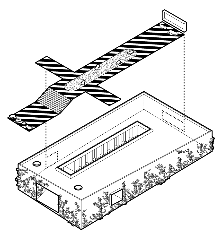 Una arquitectura con vocación atemporal, por su formalidad y su materialidad, alejada de convencionalismos contemporáneos con objeto de recuperar los modos constructivos tradicionales, donde prevalece la técnica manual y no la industrial; donde se construye con la memoria y no con la moda. Como el onírico Danteum[1] de Giuseppe Terragni, el edificio se encierra en sí mismo, discrimina su exterior para buscar la contemplación y la reunión social, contrastando su piel austera y silenciosa con su interior colorido y dialogante. La materialidad se muestra a través de una dualidad primigenia como es la piedra y el tiempo. Desde la gravilla, al canto rodado; de la laja hasta la roca. Siendo el suelo que caminamos, el techo que habitamos y el asiento en donde descansamos. Por último, el tiempo y su discurrir continuo darán testimonio del paso de las estaciones con una vegetación que cubrirá por completo la piel exterior y tornará de verde a rojo y la nada. Y así siempre.