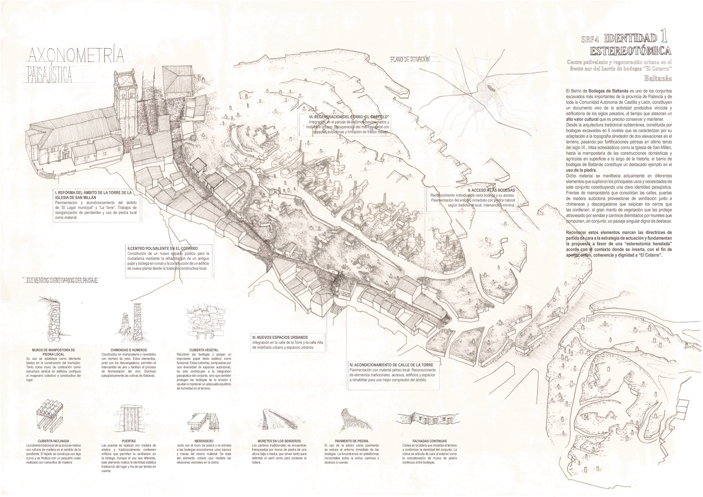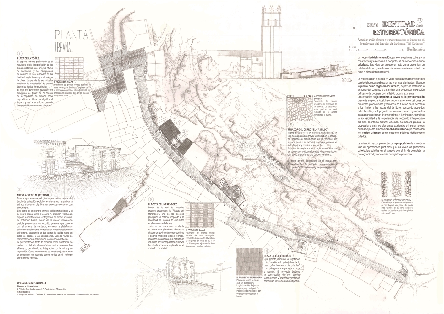 La recuperación y puesta en valor de esta zona meridional del barrio de bodegas se basa en las premisas planteadas. Usando la piedra como regenerador urbano, capaz de restaurar la armonía del conjunto y garantizar una adecuada integración del barrio de bodegas con el tejido urbano existente. Los espacios se jerarquizan a través de la pavimentación drenante en piedra local, insertando una serie de patrones de diferentes proporciones y tamaños en función de la cercanía a los límites y las trazas del territorio, buscando acuerdos entre la calle y la topografía de manera que se regularice las instalaciones urbanas de saneamiento e iluminación, se mejore la accesibilidad y la experiencia del recorrido interpretativo del bien de interés cultural. Además, de manera precisa, la propuesta encaja los elementos existentes e inserta nuevas piezas de piedra a modo de mobiliario urbano que consolidan los vacíos urbanos como espacios públicos debidamente dotados.