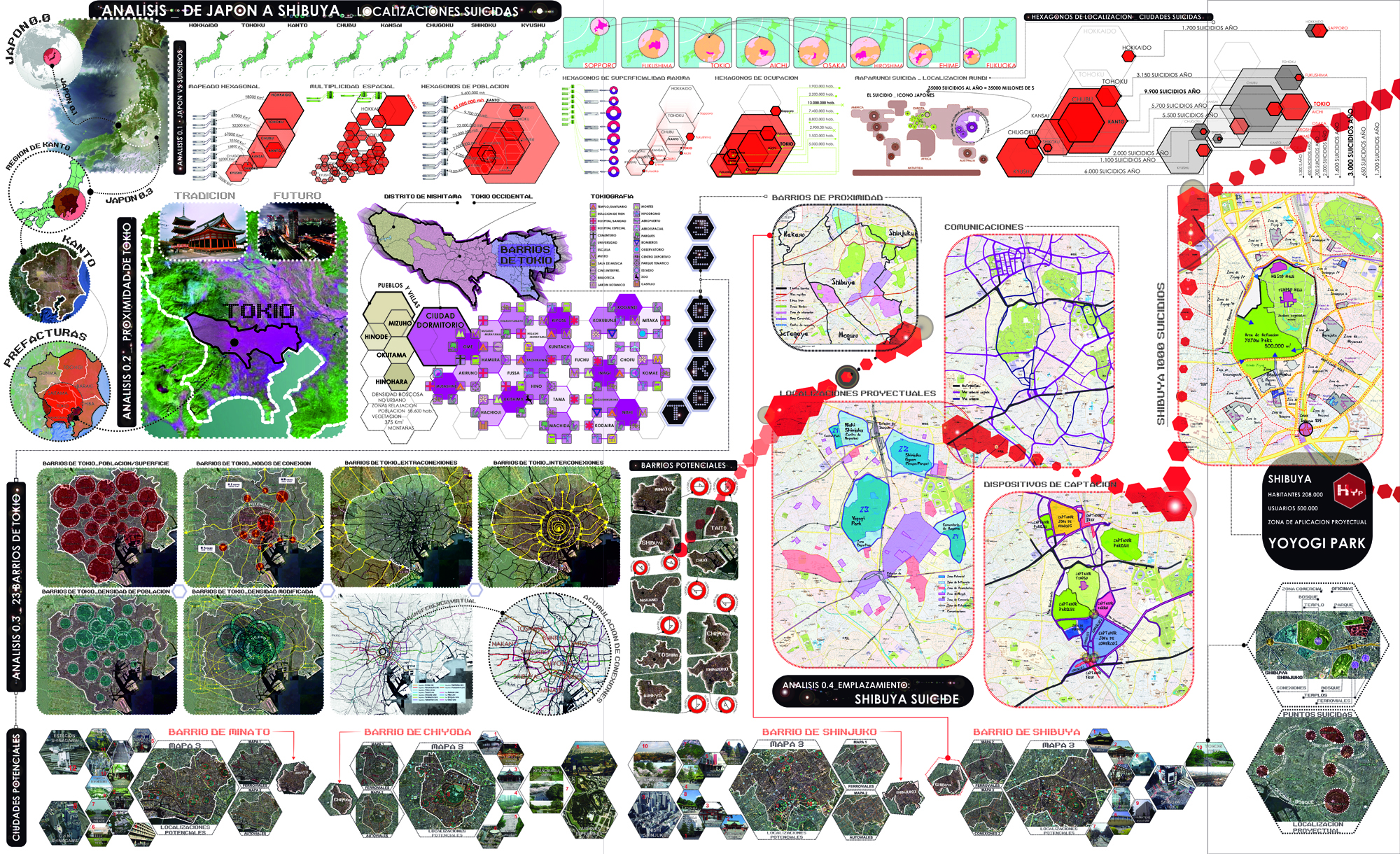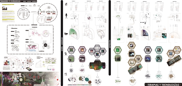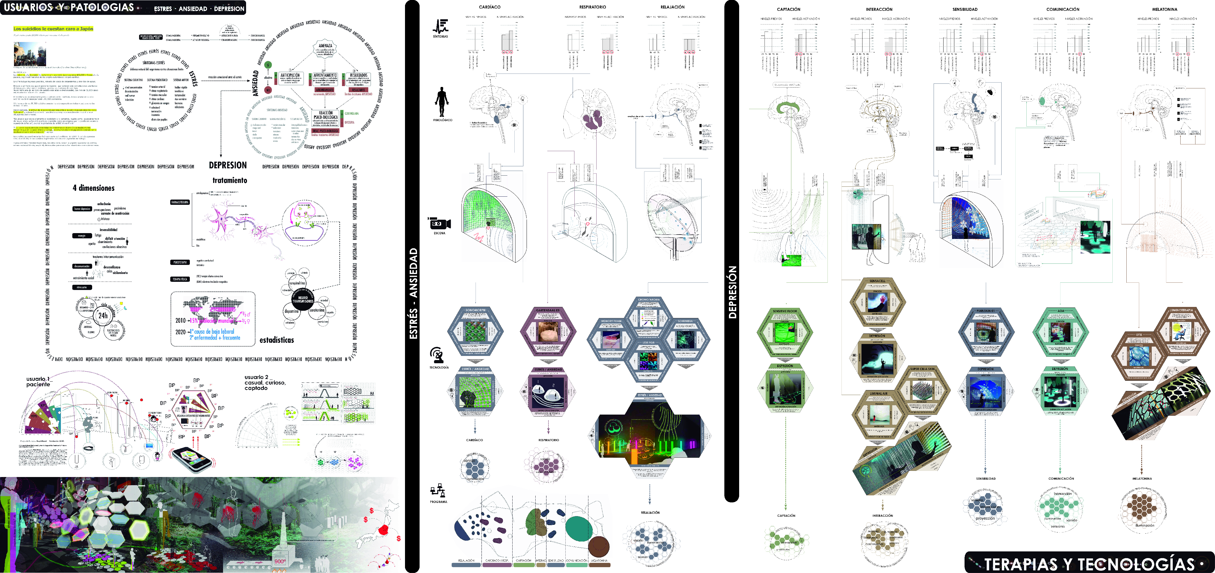 Estudio/Análisis de la posibilidad de generar modificaciones o cambios en la condición psicologica de los usuarios (Ansiedad/Estres/Depresión) a traves de terapias tecnológicas apoyadas en la arquitectura. Esta primera parte se centra en la busqueda de aquellas tecnologías que pueden dar cabida al desarrollo de una arquitectura novedosa y singular, que no destaca en lo constructivo, pero si en lo funcional, así como el estudio de las enfermedades relacionadas con el Estres, Ansiedad y Depresión. La localización adquiere importancia al relacionar las enfermedades mentales con la tipología del suicidio. Japón como pais condicionante, donde la potencia de las enfermedades mentales que llevan al suicidio se convierte en una religión. Tokio como ciudad, Shibuya como localización y Yoyogi Park como ubicación de nuestro proyecto, una ubicación natural, libre de tecnología, donde nuestro proyecto toma un papel muy importante.