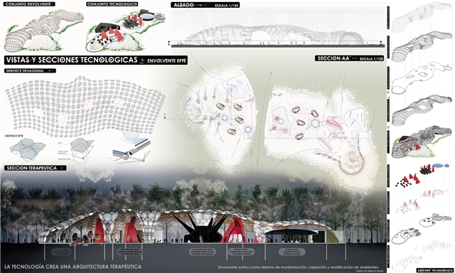 Creación de la arquitectura como máquina para desarrollar las terapias, apoyadas por las tecnologías (iluminación, sonido, ambiente, visual, material).