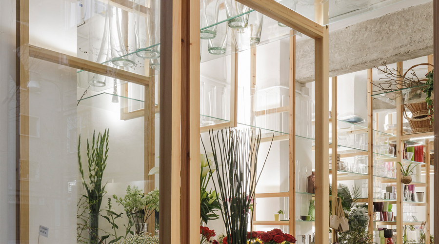El proyecto abstrae la escalera de madera y la convierte en el objeto principal que configura el nuevo espacio de la floristería, convirtiéndose en soporte para la orquídea, albergando las instalaciones y arrojando luz de manera indirecta para crear un ambiente acogedor tanto para el cliente como para María y Emilio, y ayudando, junto al vidrio, a crear un fondo neutro y de pocos elementos que potencie el producto y su exuberancia.