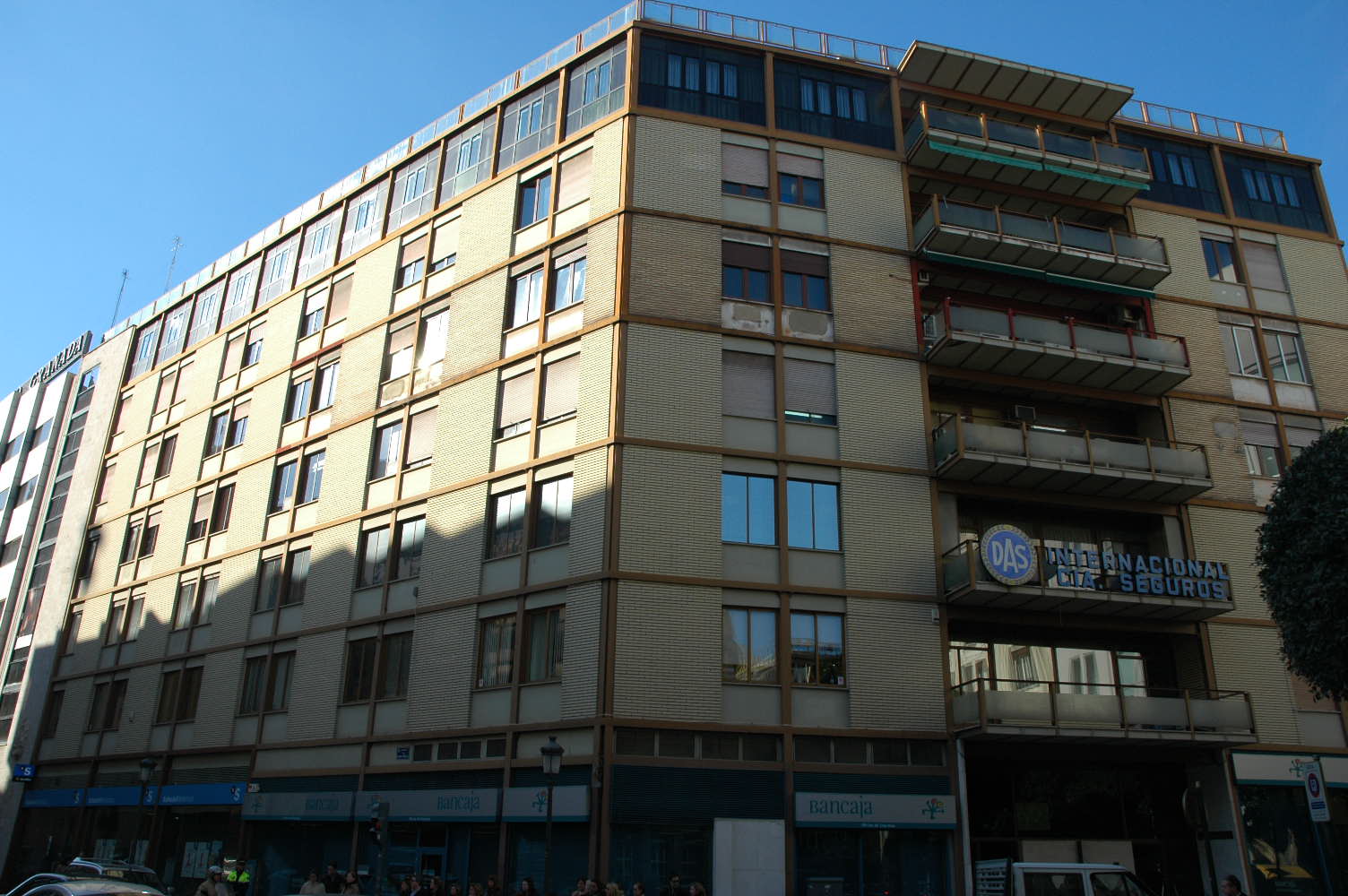 […]Por un lado, el edificio se ciñe de modo estricto al perímetro de una parcela en esquina con gran desarrollo exterior, como lo hacía la construcción del primer colegio preexistente del siglo xvi que, a pesar de sufrir una profunda intervención en 1927 por parte del arquitecto Mariano Peset, se demolería años después para ejecutar la propuesta de Estellés. Se trata por tanto de un proyecto de edificación cerrada —como la mayoría de los inmuebles del casco histórico en el que se inscribe—, densamente construido y con dos pequeños patios centrales que introducen luz y ventilación en las estancias interiores. En la configuración del volumen exterior se puede distinguir una composición tripartita del alzado principal (desplegado a lo largo de las calles Pintor Sorolla, Universidad y Salvá): el basamento de la planta baja, que combina un zócalo de piedra con los grandes acristalamientos de los locales comerciales; el desarrollo de las plantas primera a quinta, que repite nivel tras nivel la fenestración y la alternancia de llenos y vacíos dispuesta, y el remate de la sexta y última planta que, con todos los entrepaños de la estructura acristalados, recuerda a las logias de las clásicas edificaciones de esta parte de la ciudad. Una secuencia compositiva que curiosamente no se repite en el alzado menos visible del proyecto (el de la trasera calle de Miñana), al carecer este de basamento o remate diferenciados, aunque sí comparte la fenestración y la materialidad de las fachadas anteriores.
