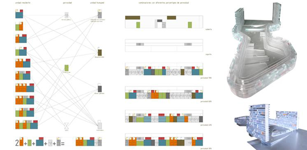 Ante las ruinas depositarias de su memoria, proponemos un banco de prueba al que la ciudad mira para pensar su evolución. Un laboratorio urbano donde ensayar estilos de vida, una toma de datos sobre el terreno como muestra exportable a futuros desarrollos. Organismos vivientes en continuo cambio y adaptación, en los que cada célula habitacional influencia en distintos grados a las que la rodean. Asignando por orden de llegada unas cotas de espacio público y privado que van conformando la membrana, se incorporan nuevos usos a medida que van surgiendo sin alterar la ordenación general. Se garantiza un margen de ampliación a cada vivienda y la posibilidad de alquilar espacios adicionales de forma temporal sin afectar al grado de porosidad general del conjunto más que en una fluctuación de densidades a lo largo de las cintas y de las torres.