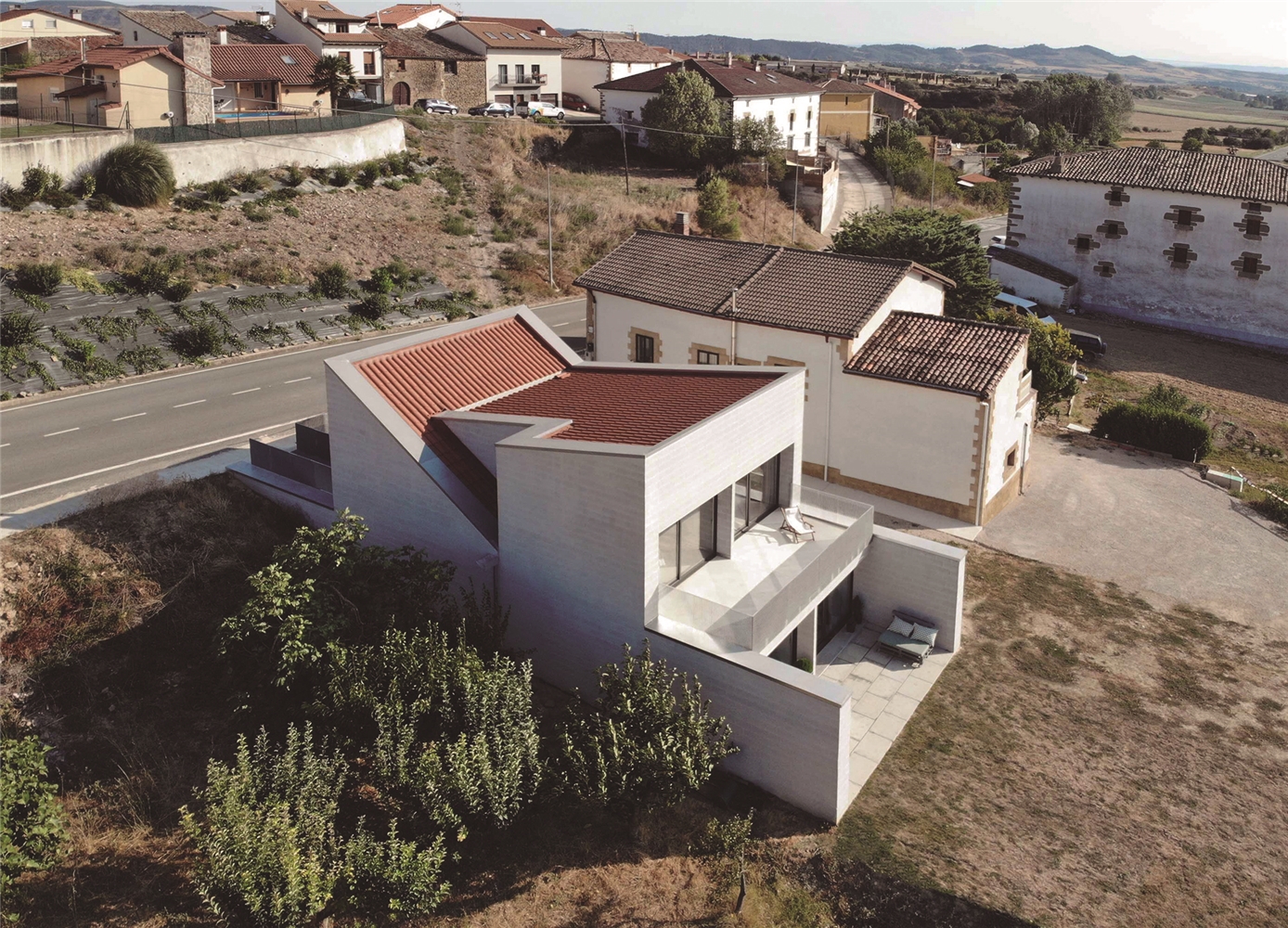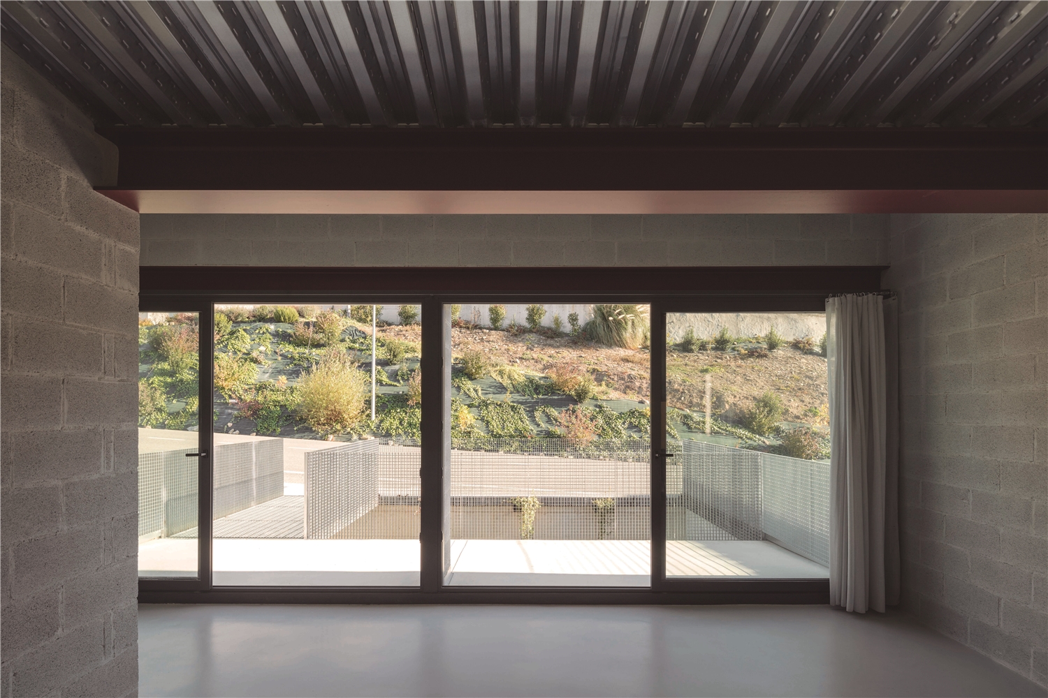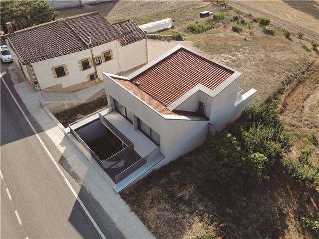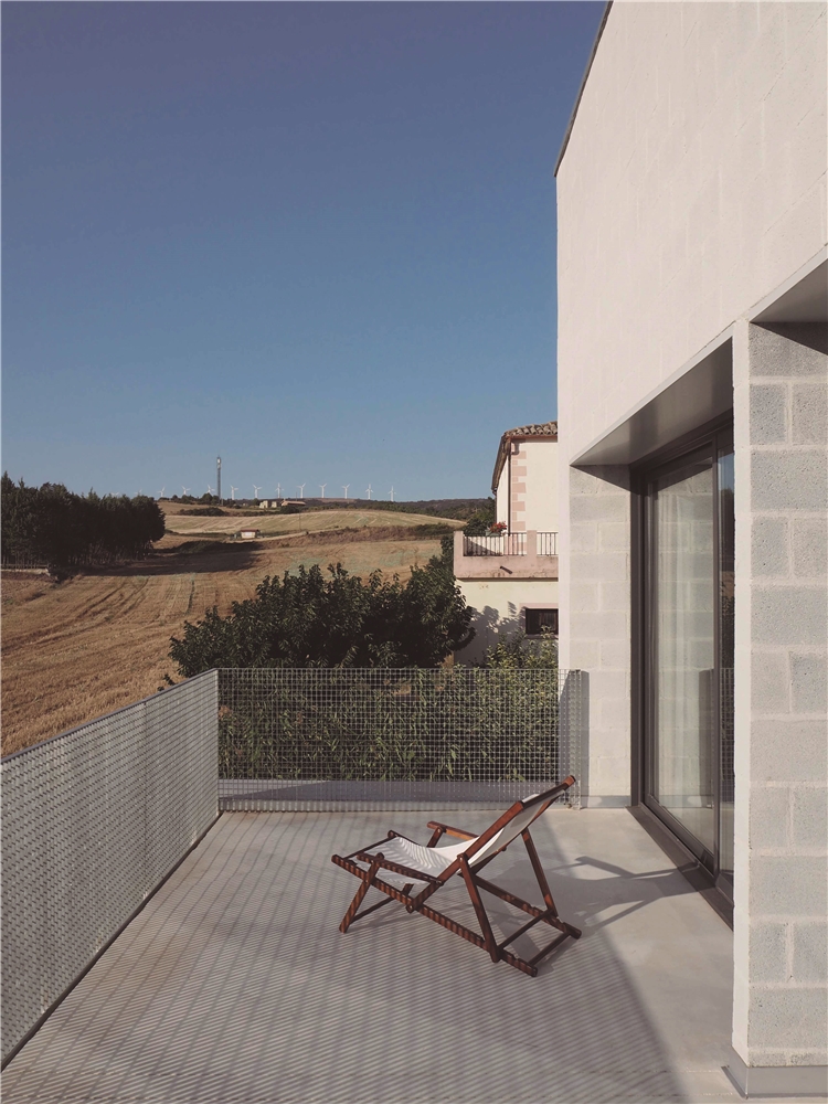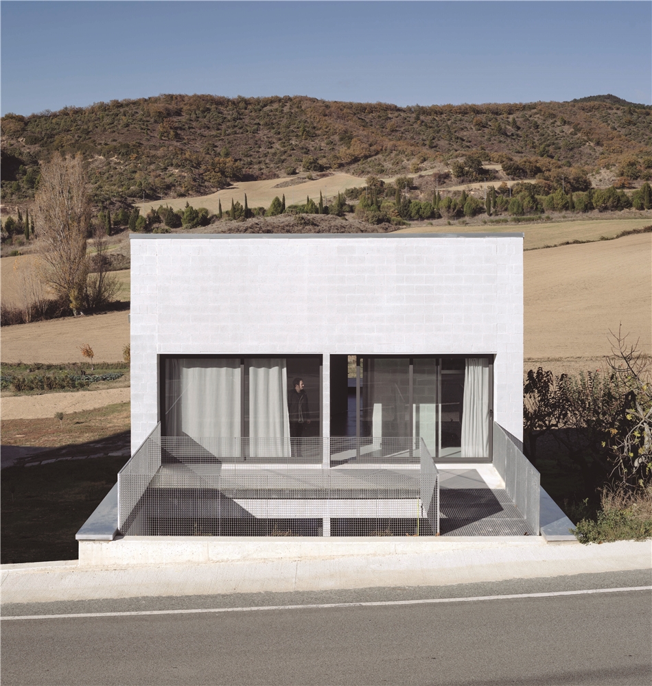 La planta superior se retranquea longitudinalmente respecto del basamento y hace de filtro entre el vial y la vivienda, posibilitando un acceso secundario a pie desde la carretera, al mismo tiempo que absorbe el paisaje lejano hacia el Noroeste desde una posición altiva. Se descubre así, un edificio de escala humana, que se percibe como de una sola planta desde la carretera y en realidad tiene dos hacia el paisaje.