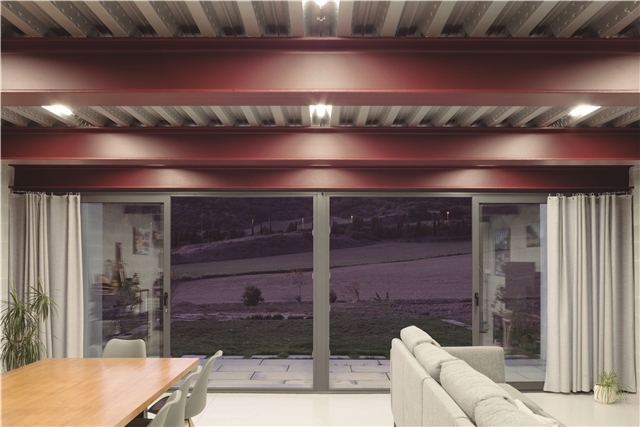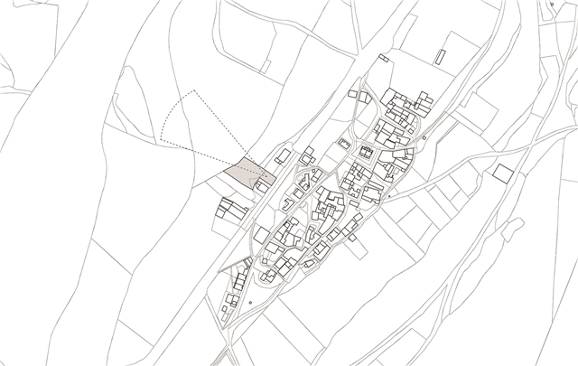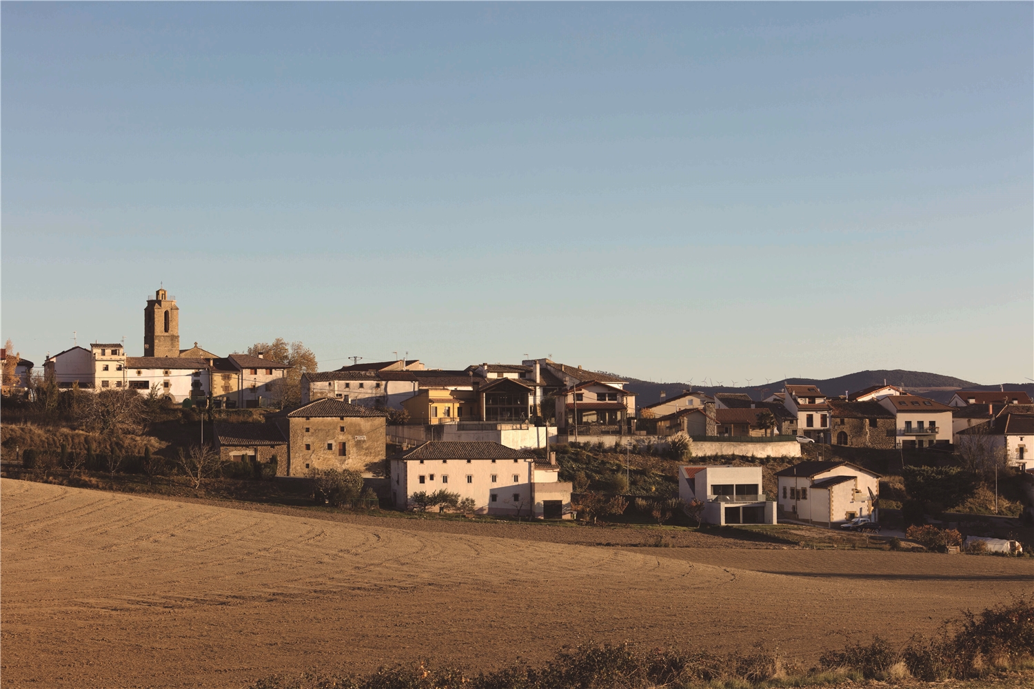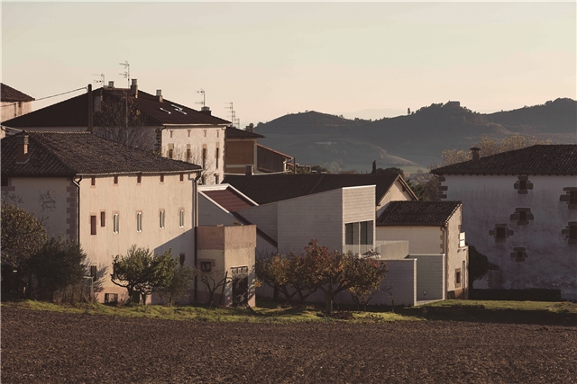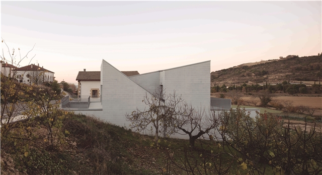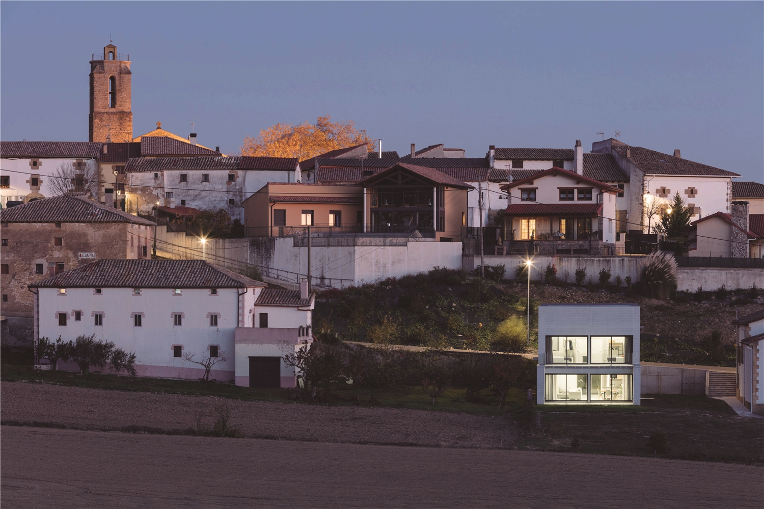 La planta superior se retranquea longitudinalmente respecto del basamento y hace de filtro entre el vial y la vivienda, posibilitando un acceso secundario a pie desde la carretera, al mismo tiempo que absorbe el paisaje lejano hacia el Noroeste desde una posición altiva. Se descubre así, un edificio de escala humana, que se percibe como de una sola planta desde la carretera y en realidad tiene dos hacia el paisaje.