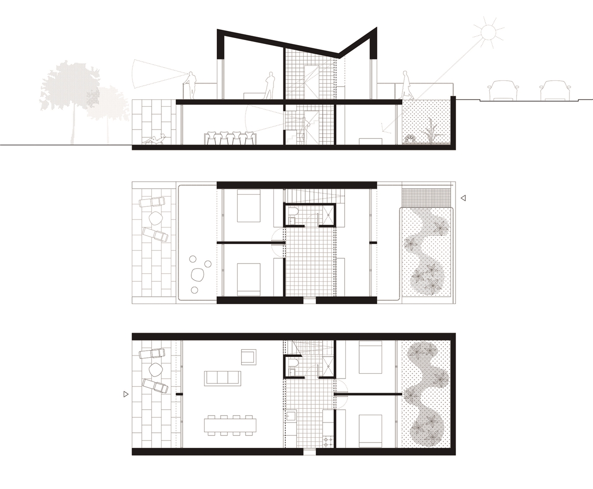 Todos los espacios de esta casa tienen la capacidad de expandirse más allá de los límites físicos de la vivienda, a través de la Pre-vivienda o la Post-vivienda o las terrazas aparecidas sobre el basamento. La eficiencia entendida desde la aportación de múltiples oportunidades de uso es el gran lujo de esta casa de reducidas dimensiones y presupuesto casi imposible.