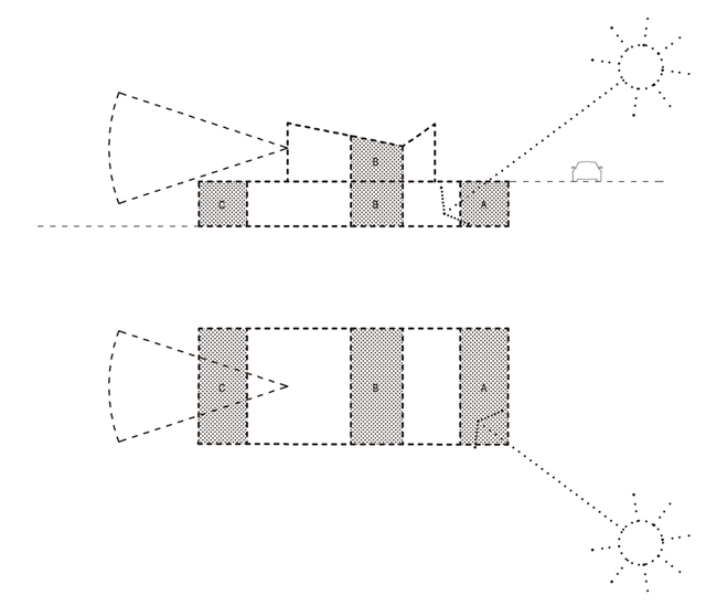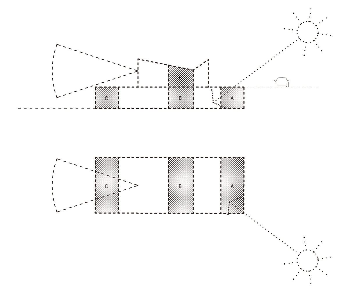 La planta inferior, denominada “basamento”, resuelve los condicionantes topográficos de diferencia de cota entre la carretera y la parcela hacia el Noroeste. La separación de 3m respecto del vial, que responde a cuestiones de seguridad, nos lleva a crear un patio inglés, protegido del viento, denominado Pre-vivienda. La orientación de este espacio exterior permite iluminar con los primeros rayos de luz y de mediodía las estancias del basamento hacia el Sureste (dormitorios), dotándolos además, de un espacio exterior íntimo que ofrece agradables sombras en verano.