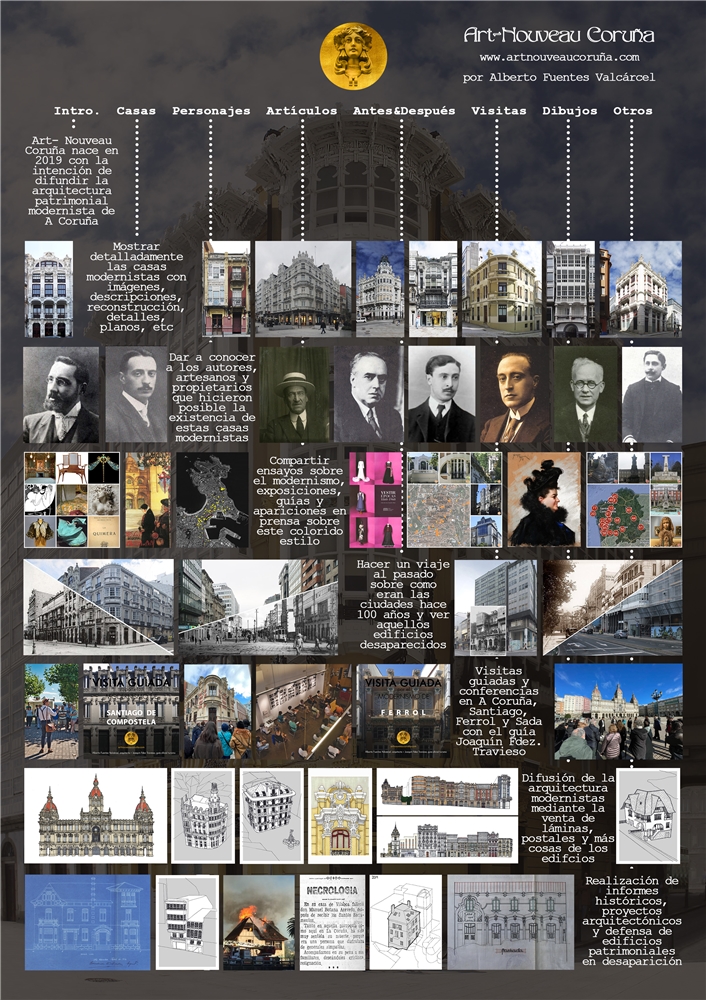 Art-Nouveau Coruña es un proyecto de investigación, difusión y diseño gráfico con punto de vista de arquitecto de la arquitectura patrimonial modernista de la ciudad de A Coruña y su provincia.