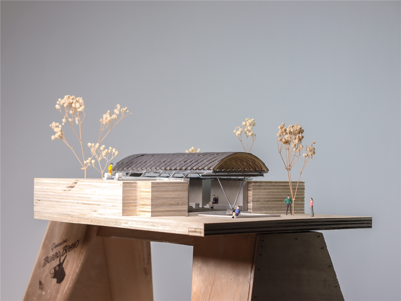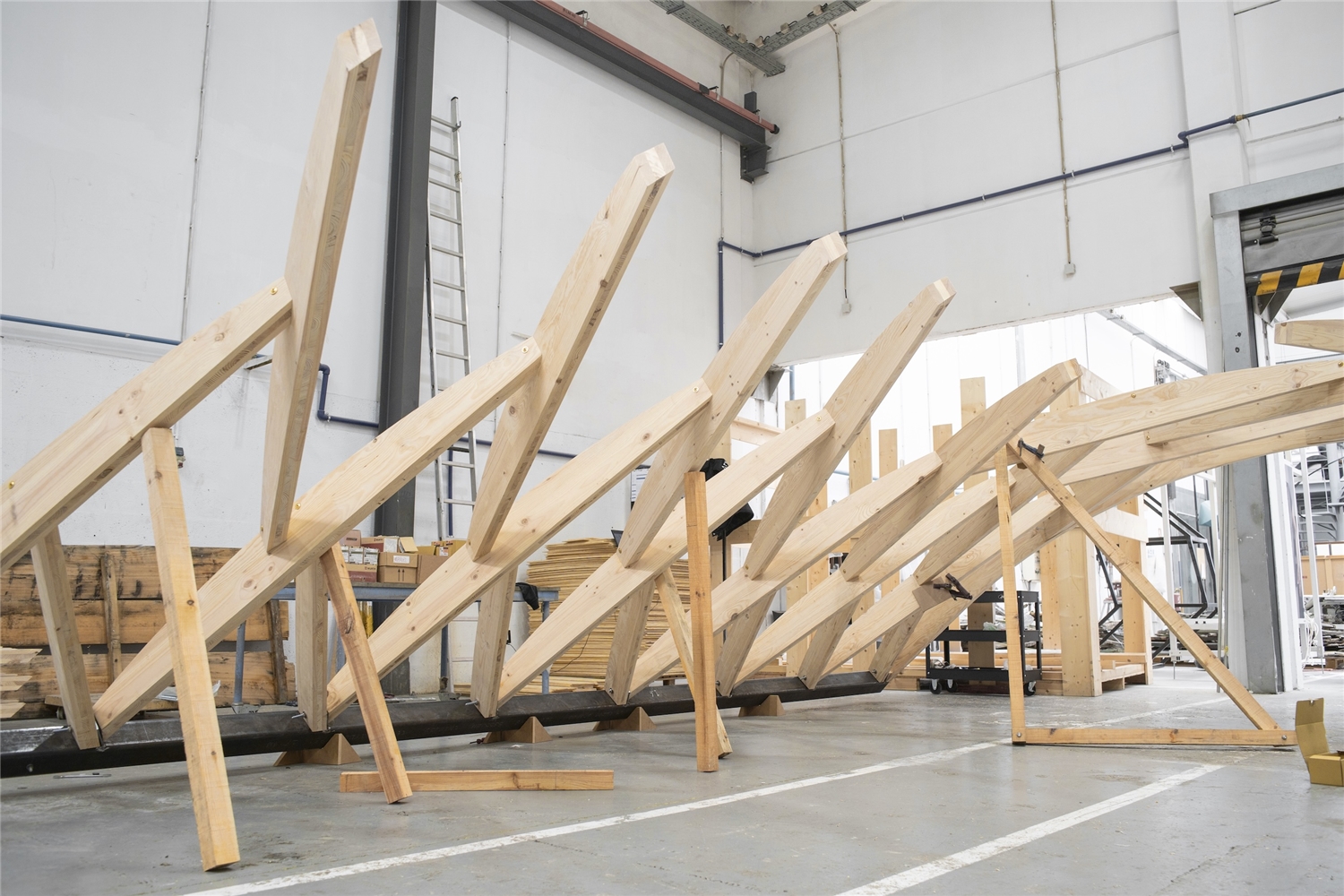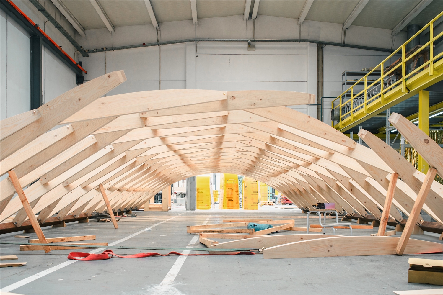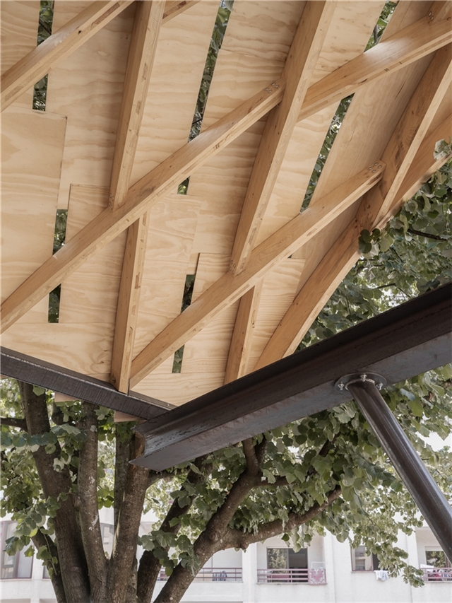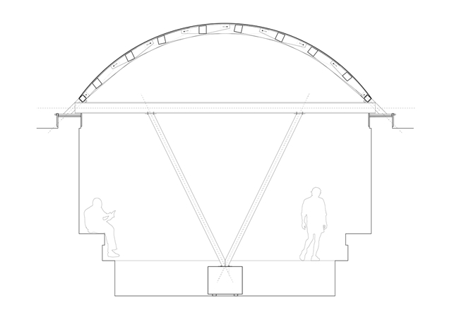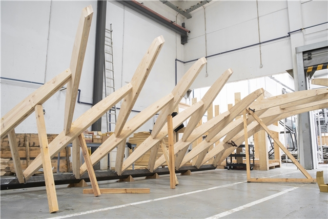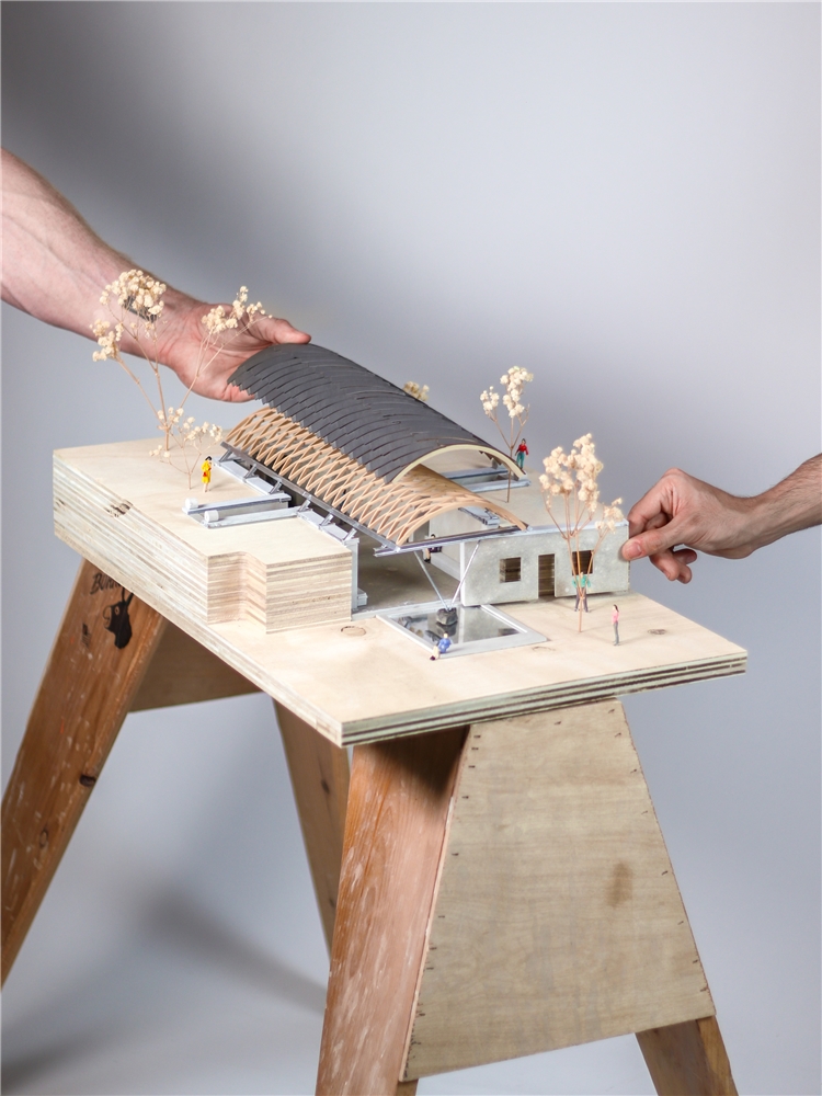 La cubierta fue construida por la carpintería local ArtWorks empleando el sistema Zollinger Lamella, ideado en la Alemania de 1920 por el ingeniero Friedrich Zollinger. Este método consiste en un entramado romboidal de listones de madera planos, ensamblados entre sí mediante pasadores y repetidos de manera modular. El resultado es una estructura autoportante de gran ligereza que, en su tiempo, se popularizó en el norte de Europa y en Latinoamérica para cubrir grandes luces con poco material, aplicándose en hangares, almacenes y cobertizos.