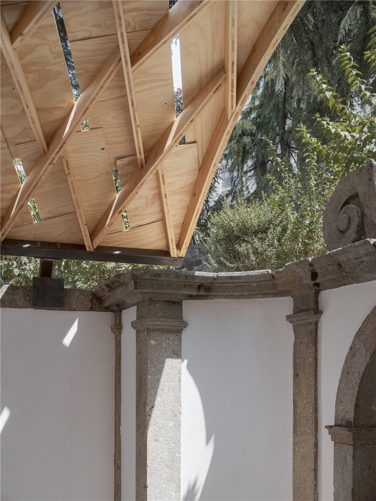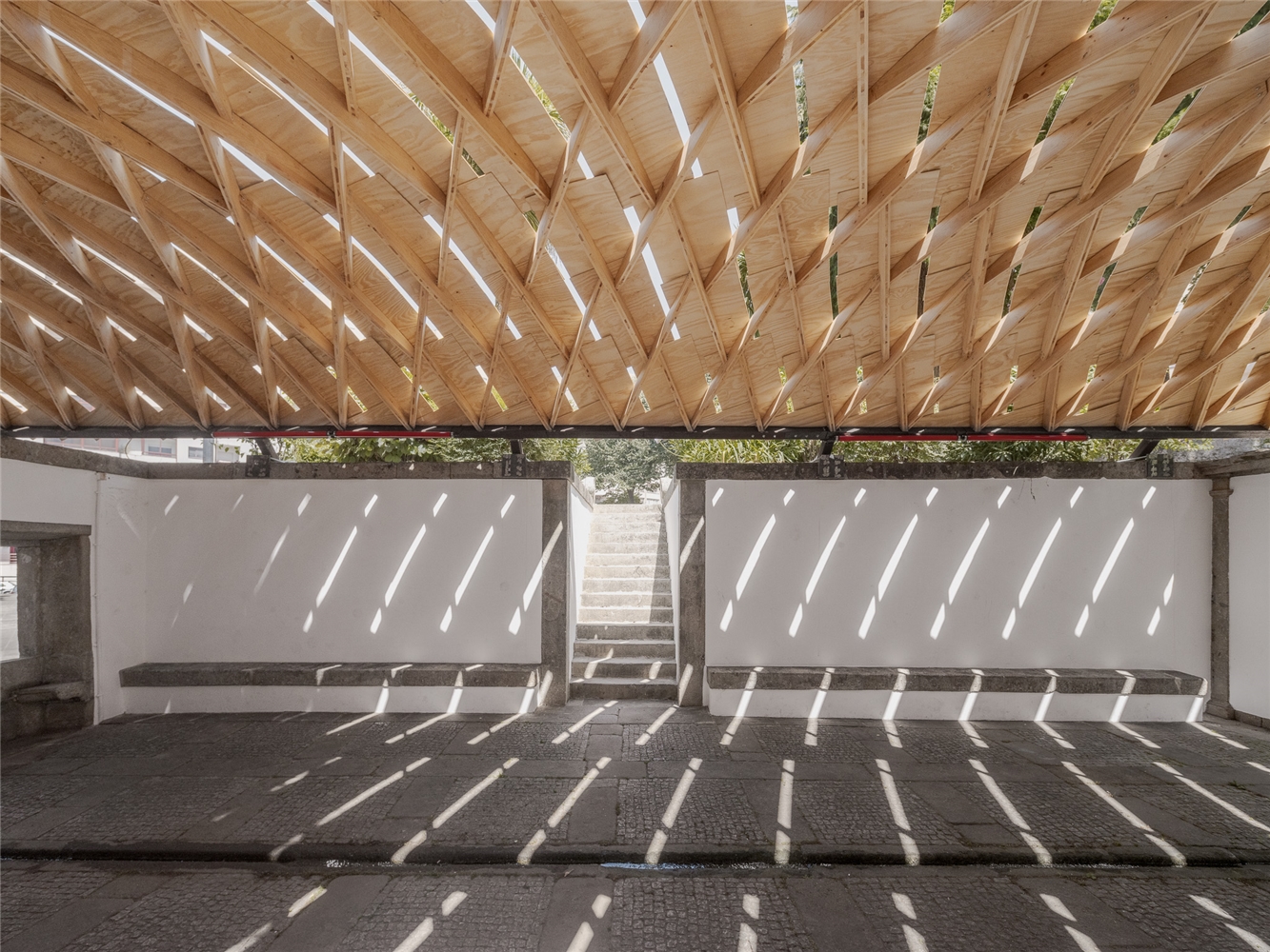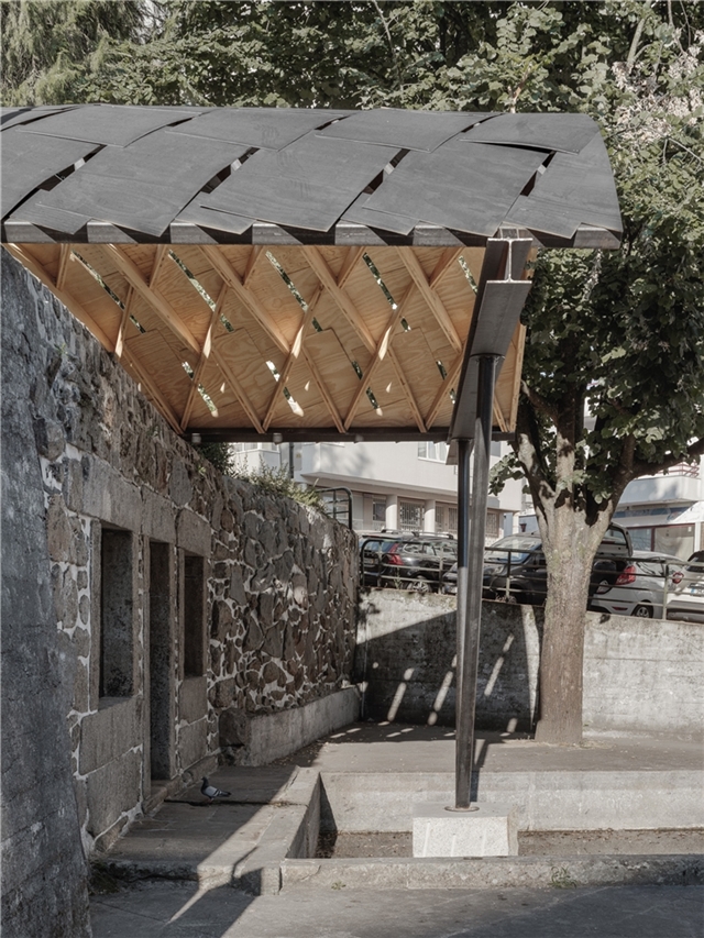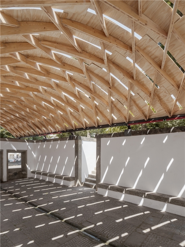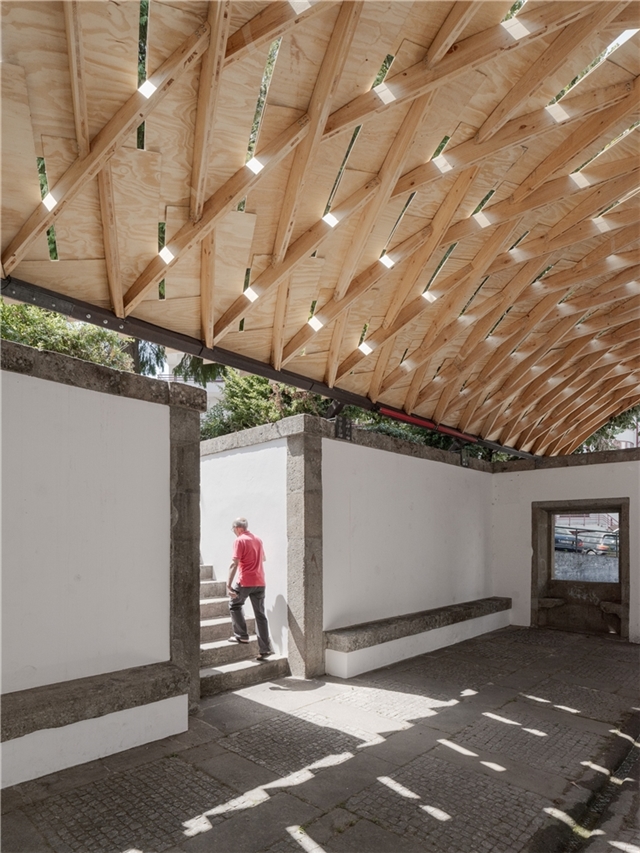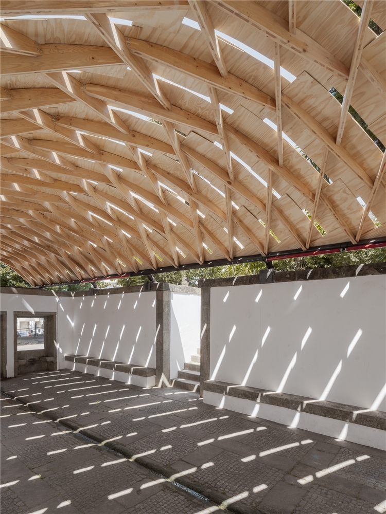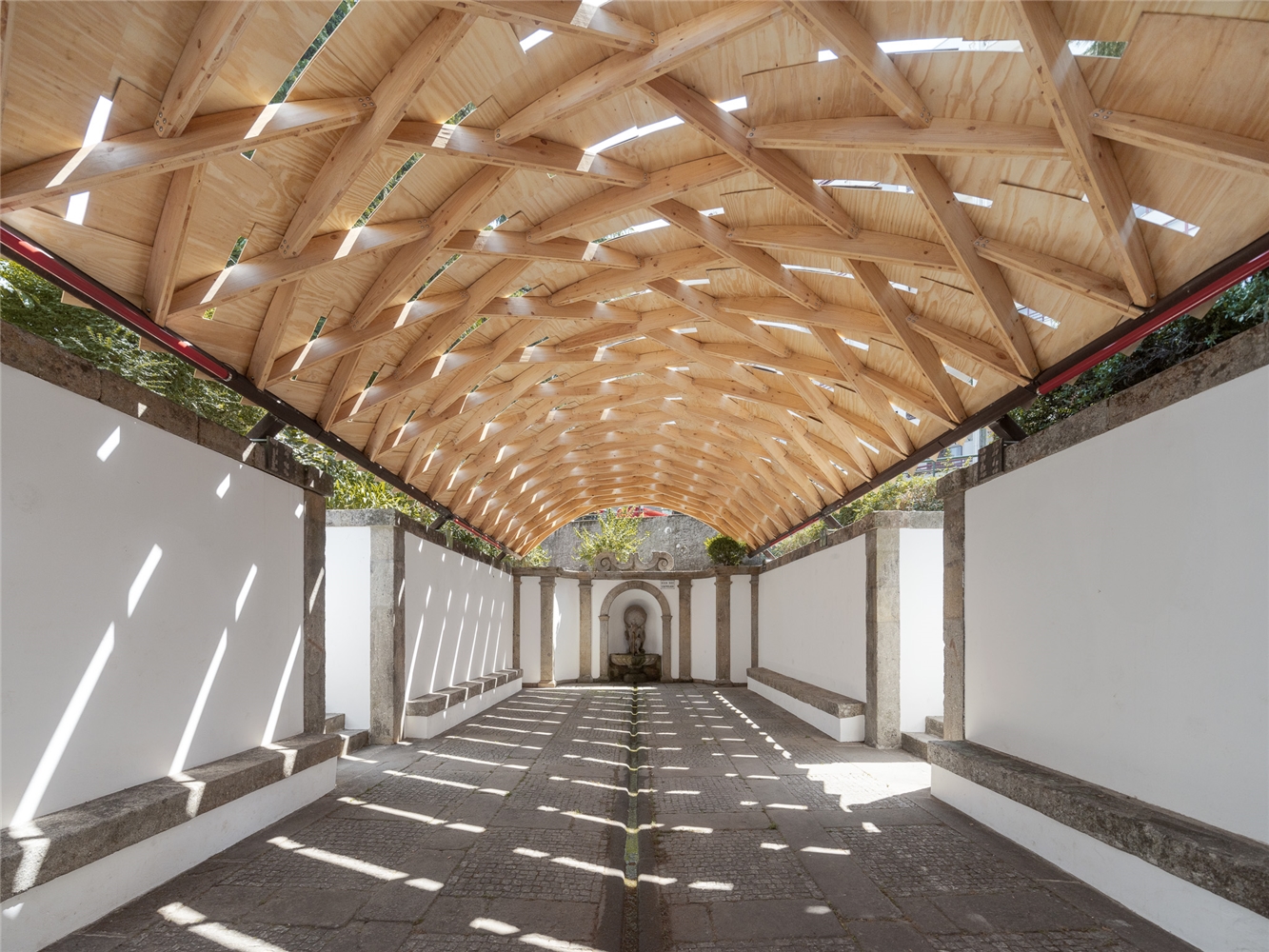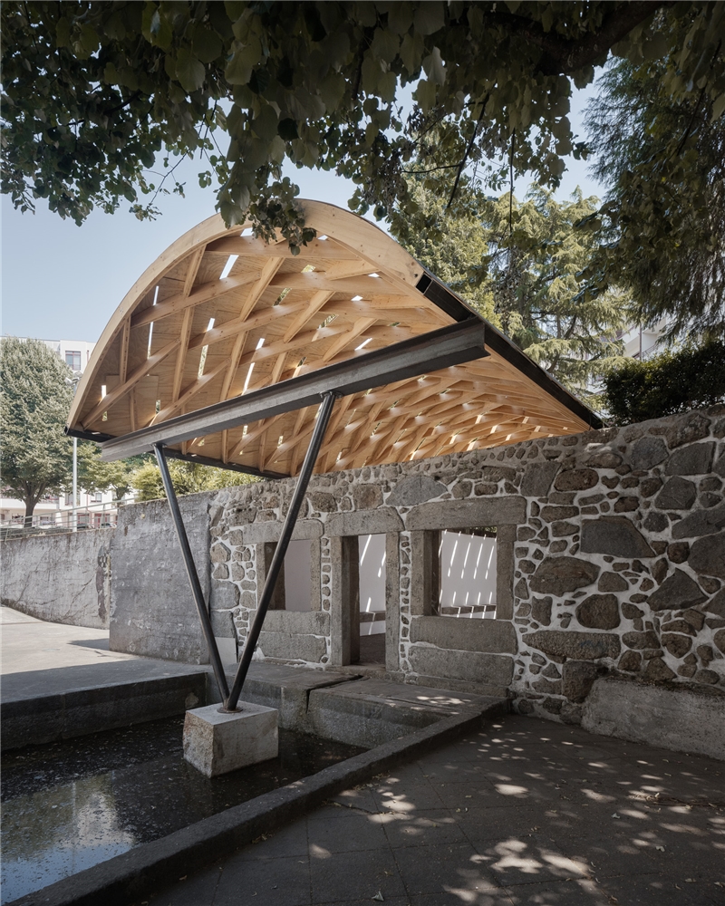 En Braga, la bóveda se reviste con paneles de contrachapado que absorben la curvatura y acentúan el ritmo diagonal, dejando pequeñas ranuras que permiten el paso de luz. Todo el conjunto descansa sobre una subestructura de acero construida con material recuperado del propio taller. Dos perfiles recorren longitudinalmente la bóveda y transmiten las cargas hacia la cornisa de piedra mediante piezas que evocan los tradicionales “sargentos” de carpintería. En la entrada principal, el sistema se apoya en un perfil IPE 240 sostenido por una estructura en forma de “V”, que concentra las cargas sobre un bloque de granito que descansa sobre el estanque. La secuencia completa acompaña así al agua en su recorrido: desde el origen en la fuente hasta su destino en el estanque.