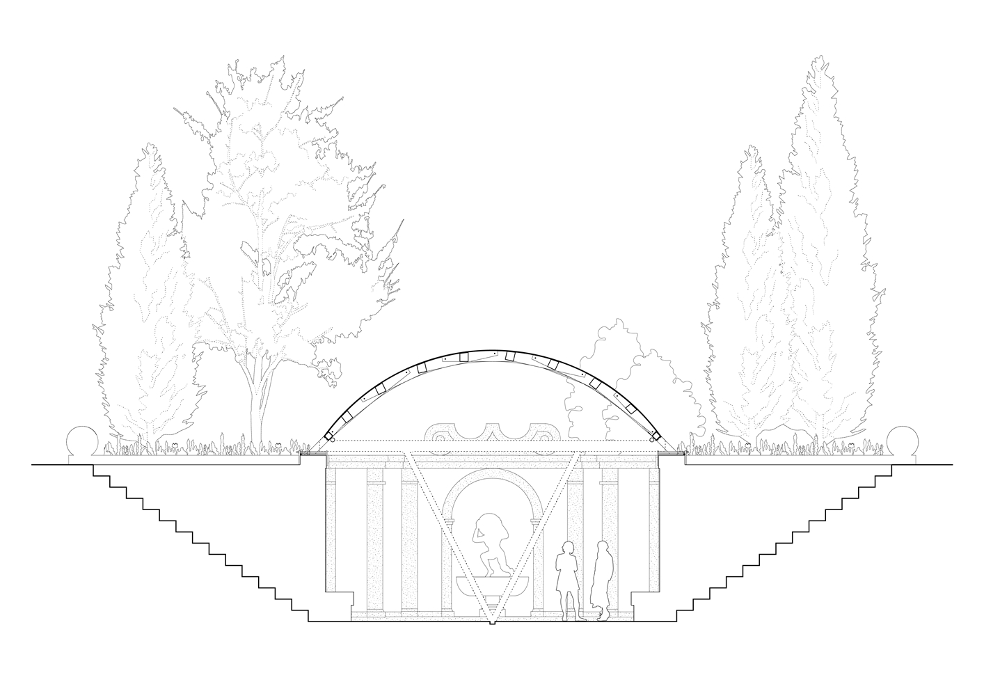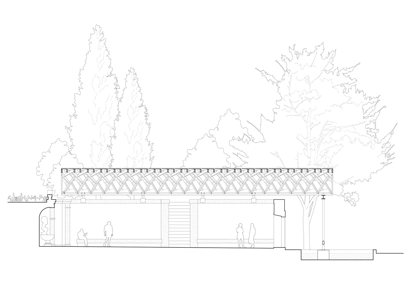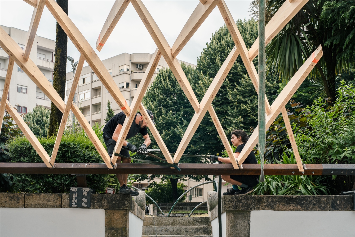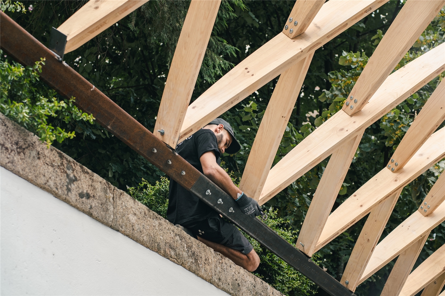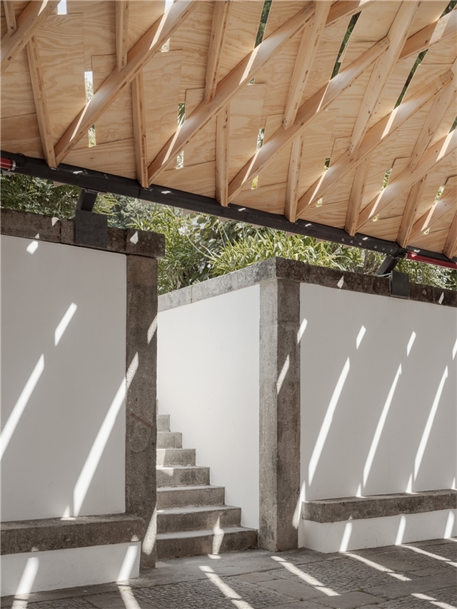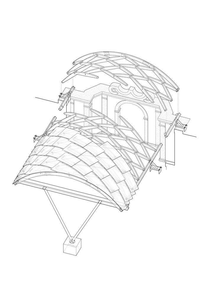 En Braga, la bóveda se reviste con paneles de contrachapado que absorben la curvatura y acentúan el ritmo diagonal, dejando pequeñas ranuras que permiten el paso de luz. Todo el conjunto descansa sobre una subestructura de acero construida con material recuperado del propio taller. Dos perfiles recorren longitudinalmente la bóveda y transmiten las cargas hacia la cornisa de piedra mediante piezas que evocan los tradicionales “sargentos” de carpintería. En la entrada principal, el sistema se apoya en un perfil IPE 240 sostenido por una estructura en forma de “V”, que concentra las cargas sobre un bloque de granito que descansa sobre el estanque. La secuencia completa acompaña así al agua en su recorrido: desde el origen en la fuente hasta su destino en el estanque.