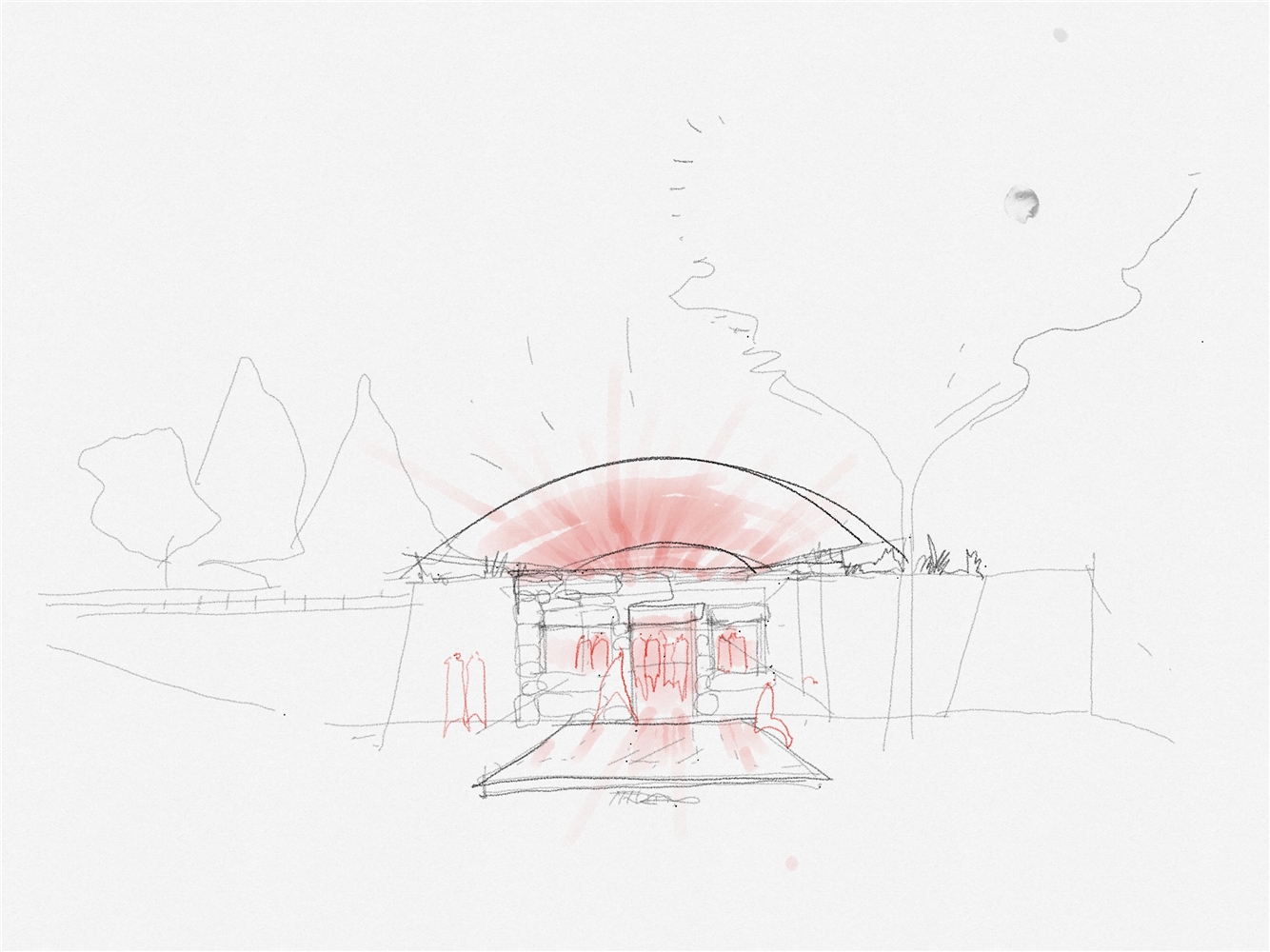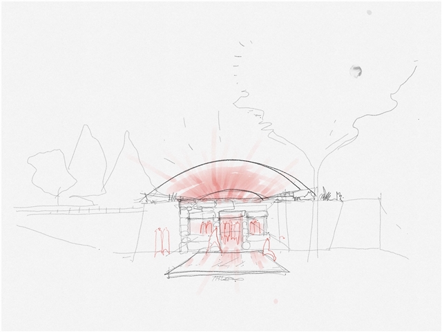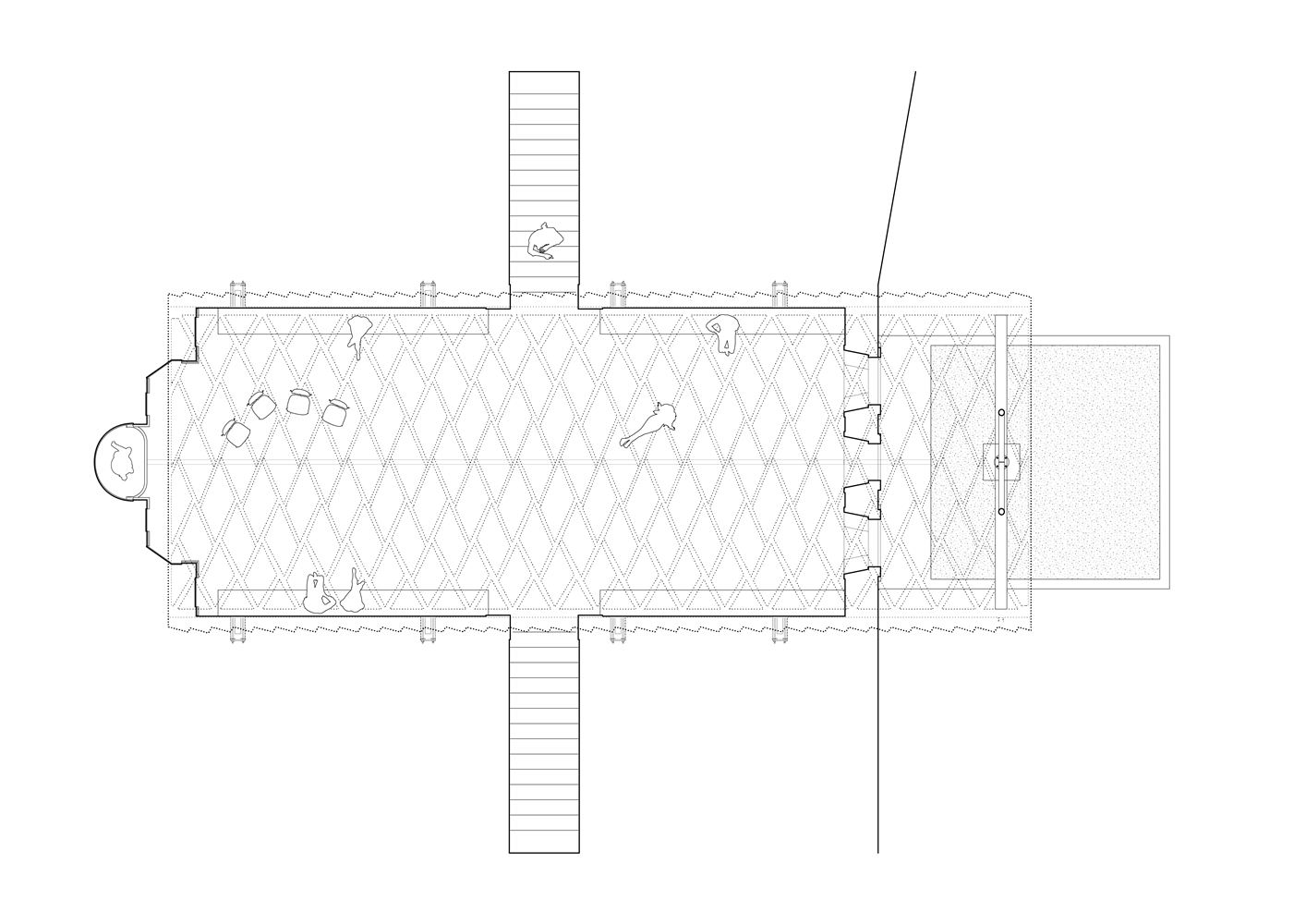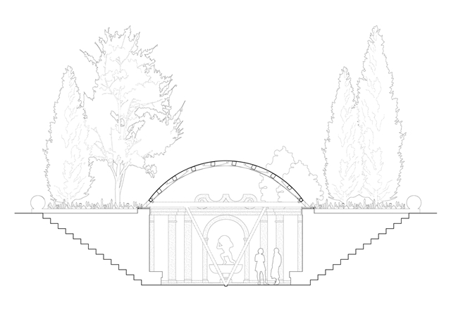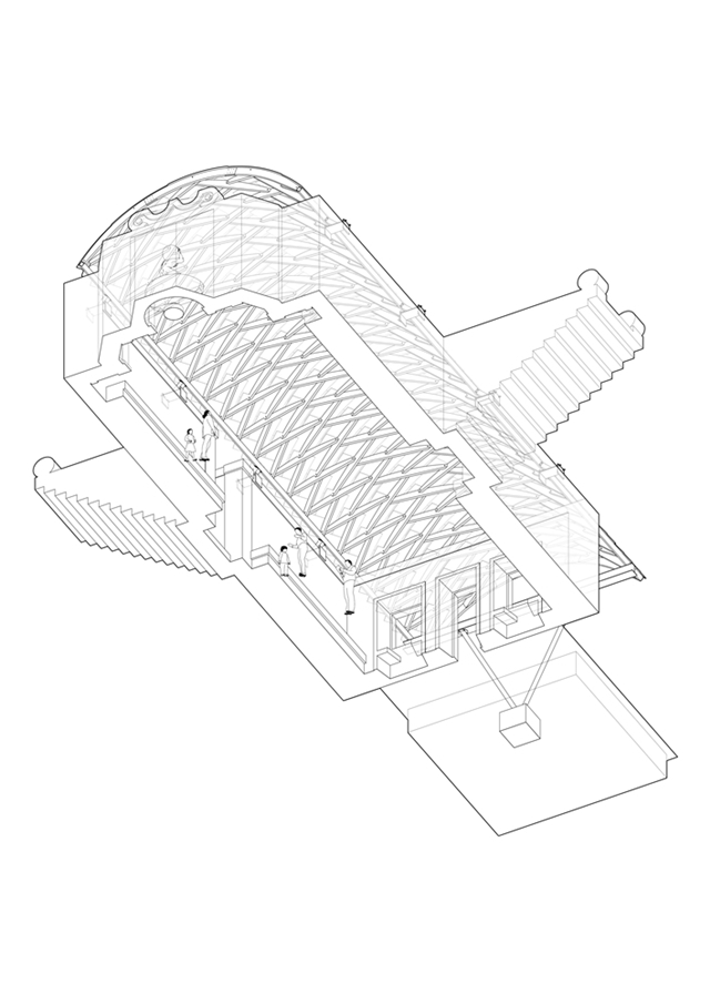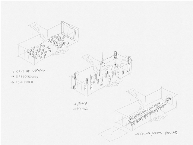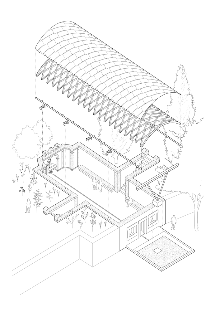 La ruina se integra en la topografía acentuada de la plaza, funcionando como muro de contención del desnivel que separa el norte del sur del barrio. El acceso se realiza desde dos frentes: por la fachada principal, precedida por un estanque de agua, o por las escalinatas laterales que conectan con la cota superior. Una acequia refuerza la simetría de la ruina, enlazando la fuente con el estanque. Aunque nunca llegó a cubrirse, la geometría de la ruina sugiere un gesto inacabado, como si aguardara ser completado. El proyecto responde a esta intuición incorporando una quinta fachada: una bóveda de madera de 6 metros de luz y 18 de longitud que se prolonga en voladizo sobre la entrada principal subrayando el acceso.