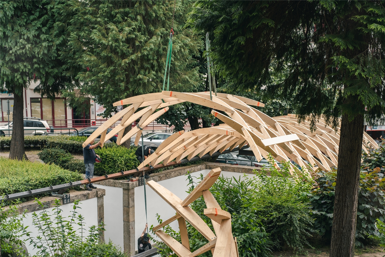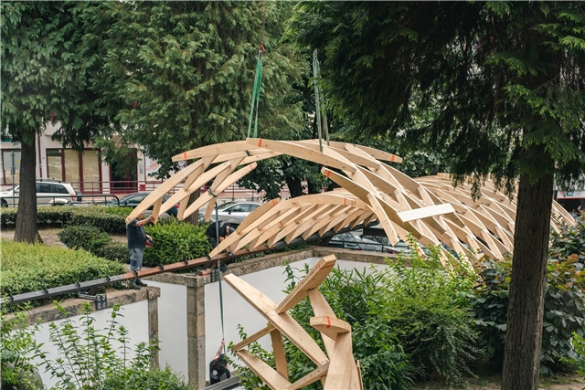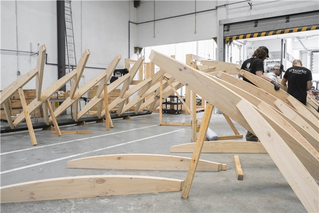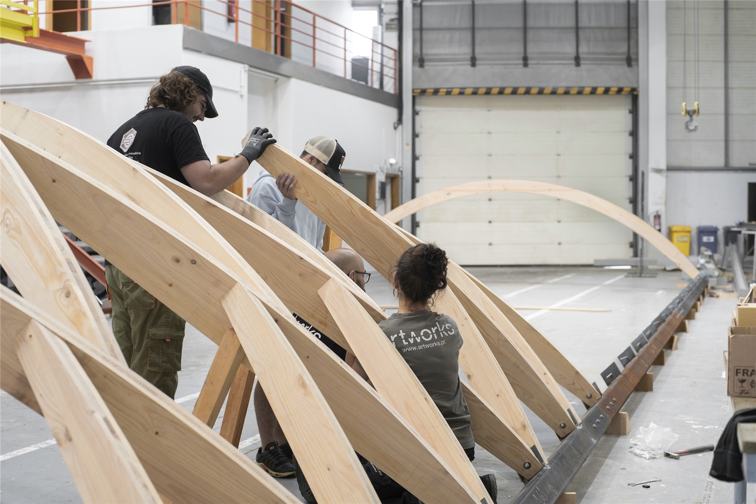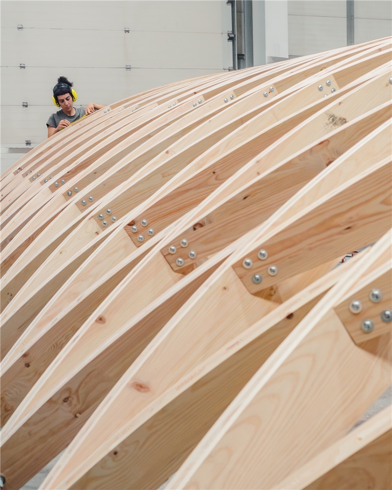La construcción se realizó íntegramente con recursos y mano de obra locales. ArtWorks, situada a apenas cuarenta kilómetros de Braga, empleó madera de pino gallego transformada en dos paneles CLT por Xilonor, en A Coruña. Las 190 piezas que componen el sistema fueron cortadas digitalmente mediante CNC, ensambladas en taller y divididas en diez segmentos transportables para su montaje in situ.