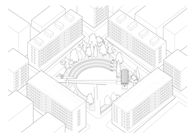 El proyecto fue diseñado por Manuel Bouzas, con el apoyo de estudiantes de la Universidad de Cornell AAP y de la empresa gallega de paneles CLT Xilonor, y se enmarca en el festival Forma da Vizinhança, comisariado por Space Transcribers para Braga 25. Entre junio y noviembre de 2025, este festival reúne ocho instalaciones urbanas en barrios periféricos de Braga, desarrolladas por equipos emergentes de Portugal, Cabo Verde y España. Su objetivo común es expandir el programa cultural más allá del centro histórico, acercándolo a los barrios que crecieron con mayor rapidez en las últimas décadas del siglo XX y donde resulta más urgente repensar el papel del espacio público en la construcción de comunidades.