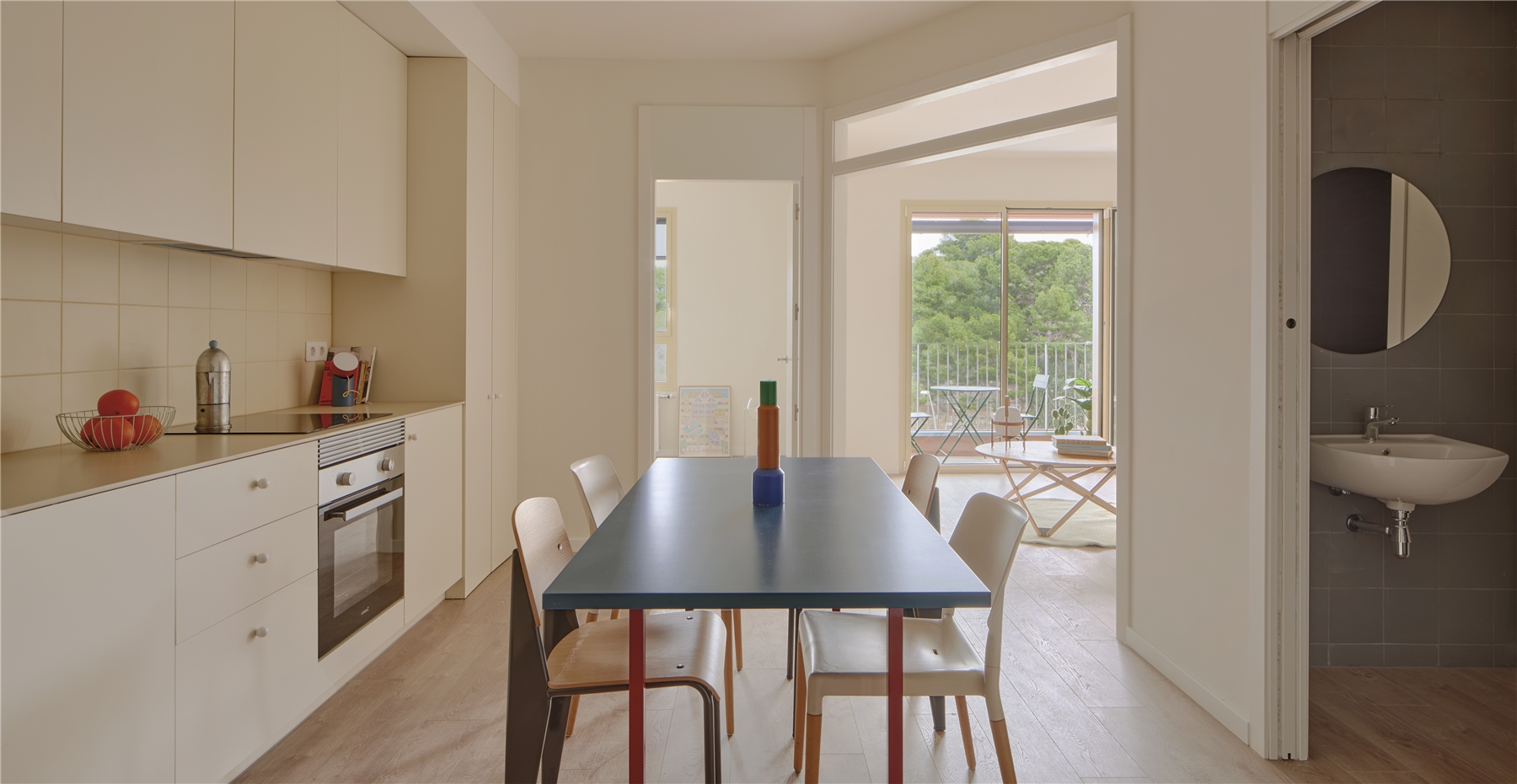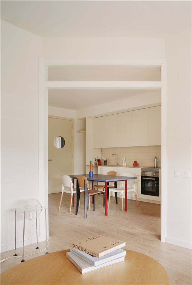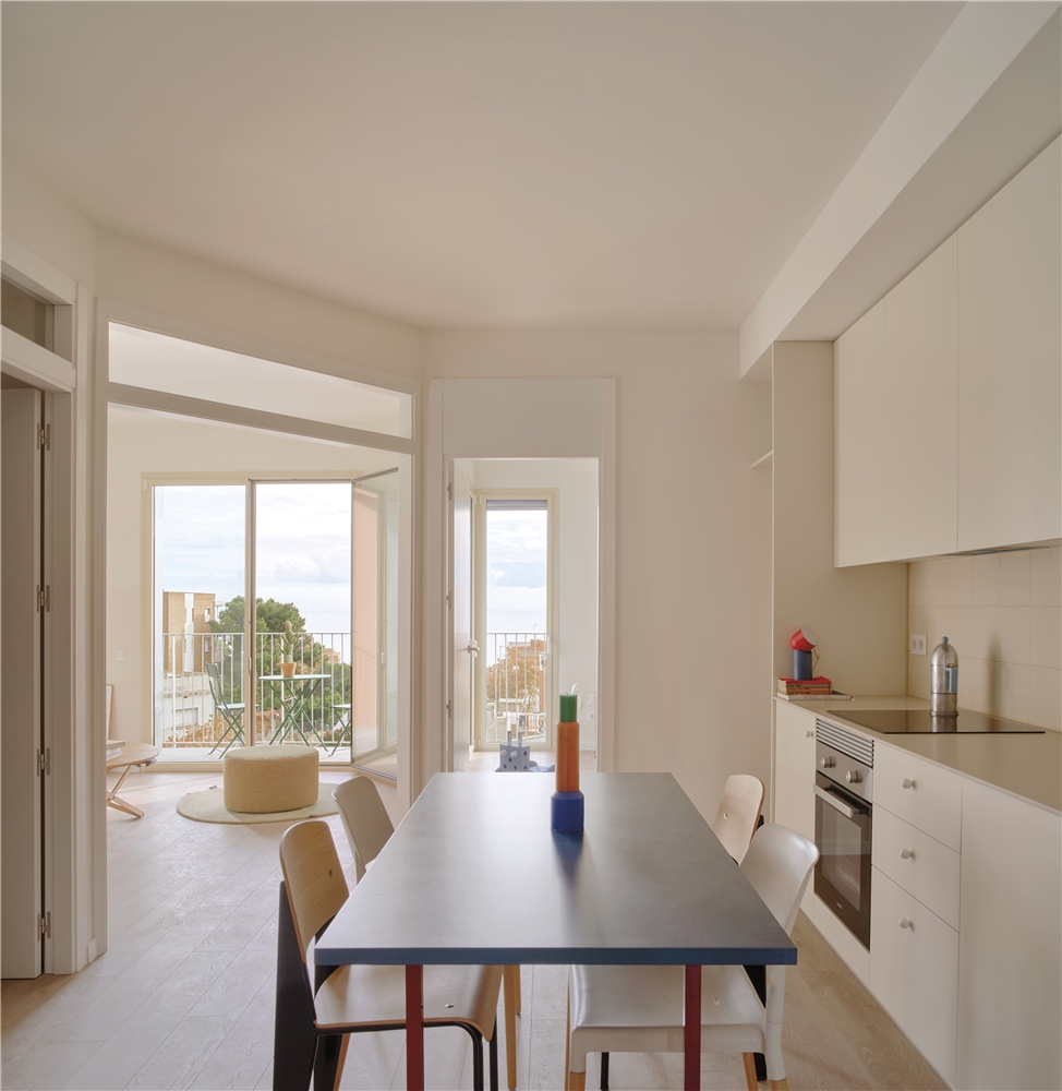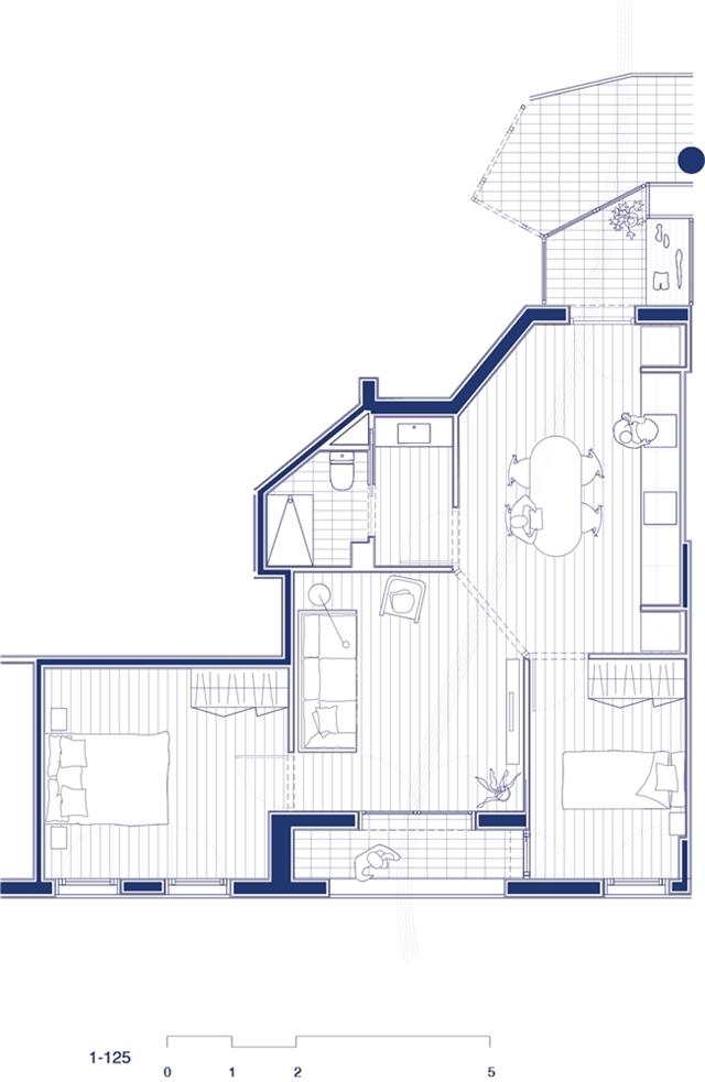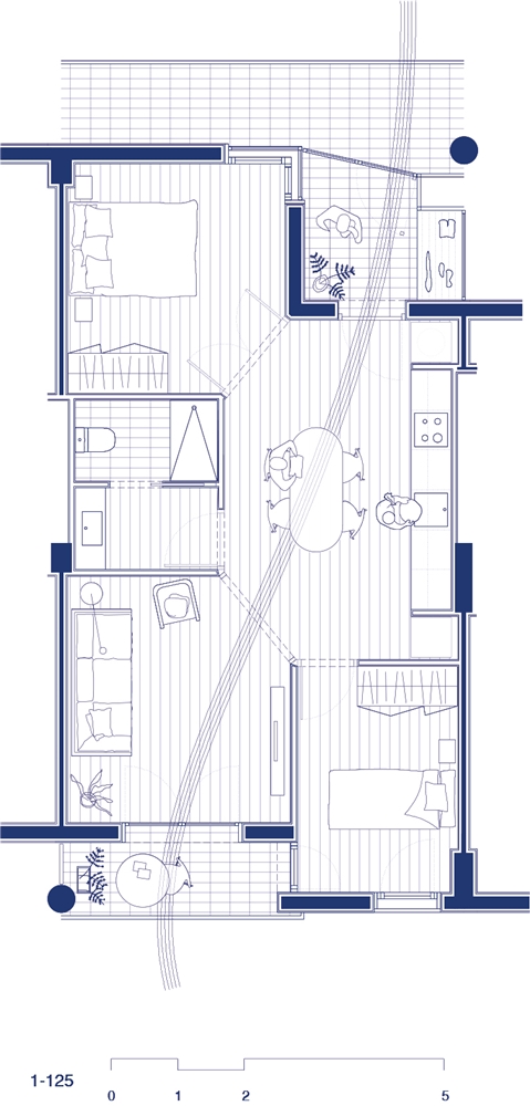 A partir de la tipología de dos dormitorios, nacen variantes que resuelven la morfología del edificio: esquina, transición entre tipos y encuentro con el núcleo. La condición que prevalece en todas es el punto innovador y estructurante del proyecto, una tipología que convierte la cocina en la nueva centralidad doméstica.