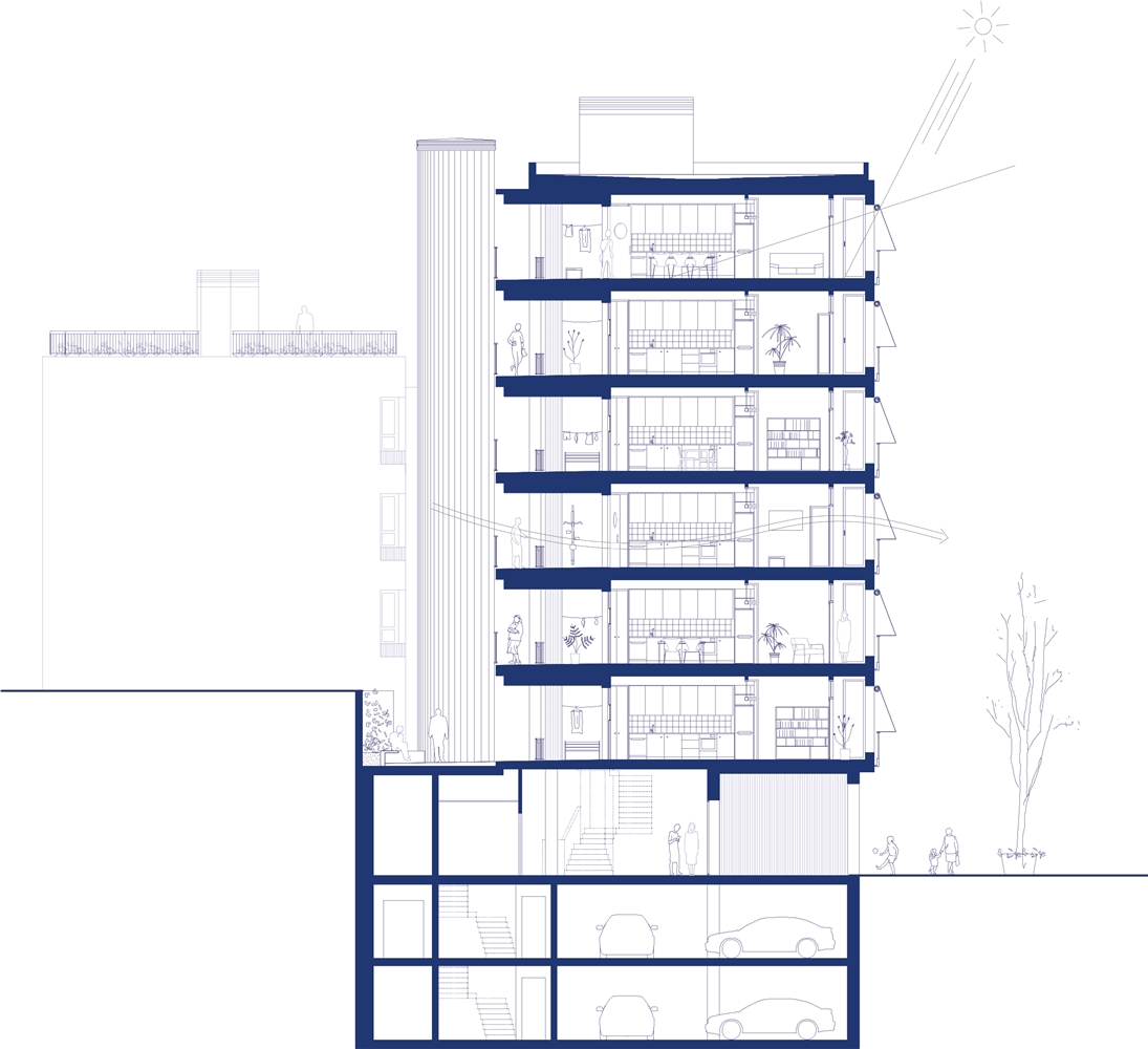 La estrategia energética prioriza sistemas pasivos que reducen la demanda. El patio interior garantiza la ventilación cruzada natural, gracias al enfrentamiento de fachadas en condiciones climáticas opuestas. La cocina se ilumina y ventila a través de ellas, manteniendo el confort climático durante todo el año. Se favorece la captación solar a través de ventanales en fachadas sur y oeste, protegidos en verano mediante aleros y toldos móviles. La captación se aprovecha al máximo gracias a la gran inercia térmica de la estructura de hormigón sin falsos techos. Más allá de priorizar los sistemas pasivos, se propone un sistema de climatización muy optimizado para la demanda energética restante: un sistema de aerotermia centralizado y reforzado con placas fotovoltaicas. Finalmente se propone el uso de materiales reciclados y reciclables (paneles de tiza, aluminio...).
