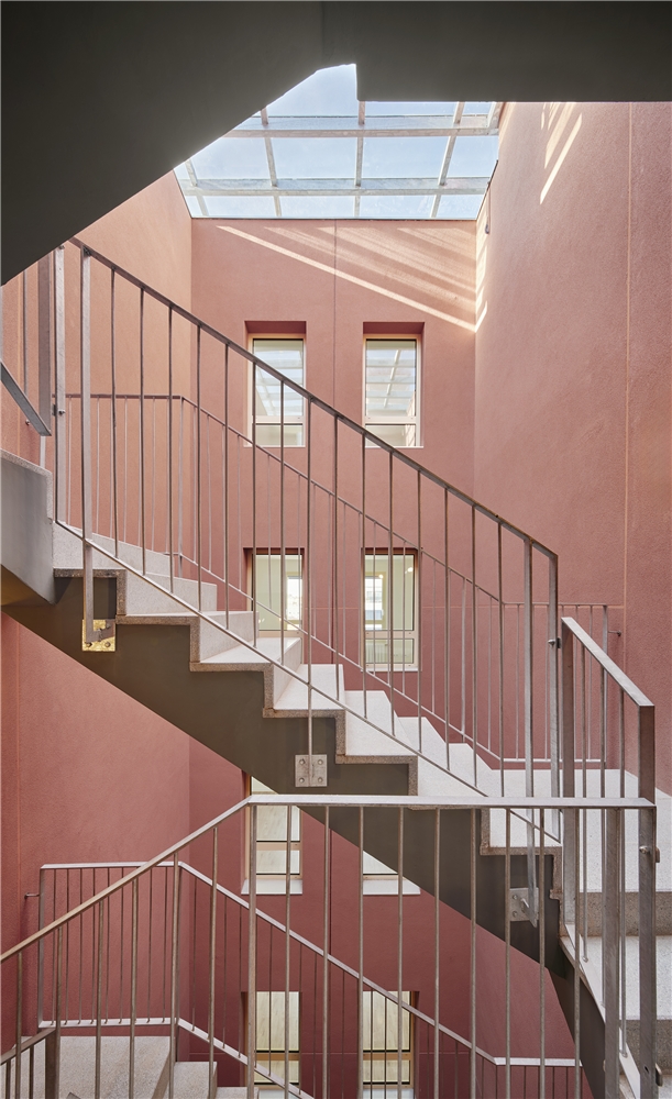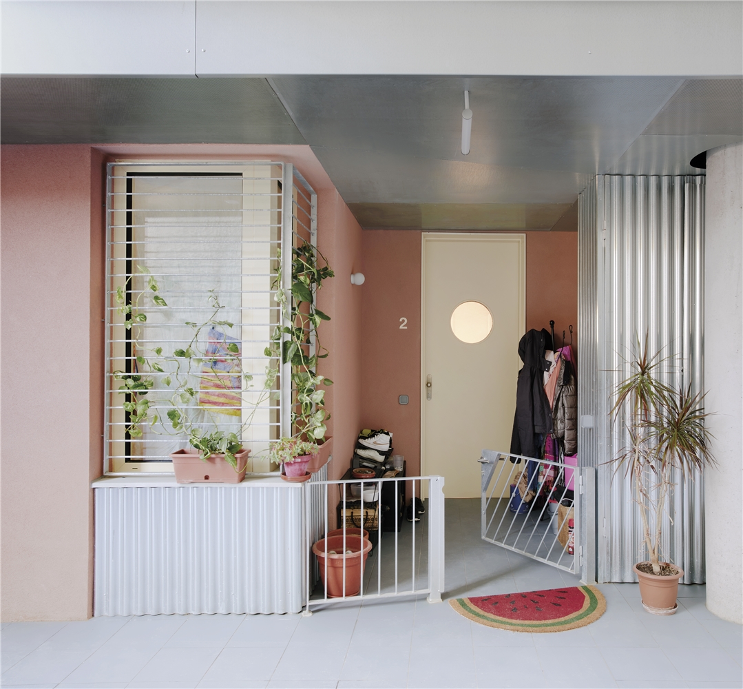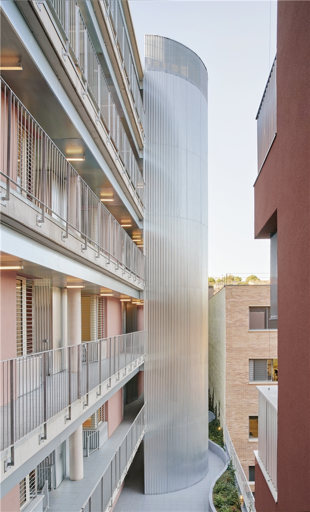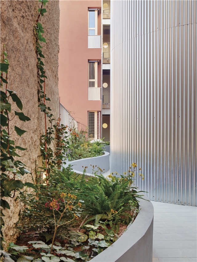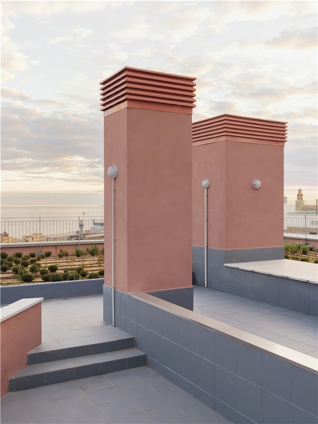 El patio configura un espacio de ocio y cuidados comunitario. Una única pieza lo vertebra y proporciona tanto jardineras como bancos para el descanso. Las relaciones vecinales también se fomentan con pasarelas exteriores que conectan las viviendas y culminan en la cubierta con vistas al mar, un espacio diseñado para su uso y disfrute. Aquí, como en medianeras y patio, se coloca vegetación que ayuda a mitigar el efecto isla de calor y propiciar un microclima fresco.