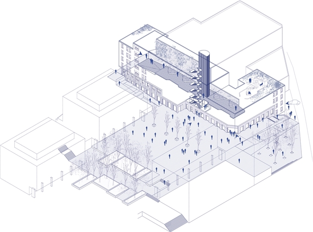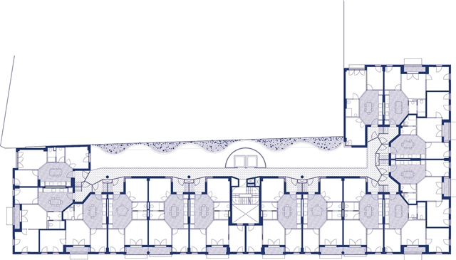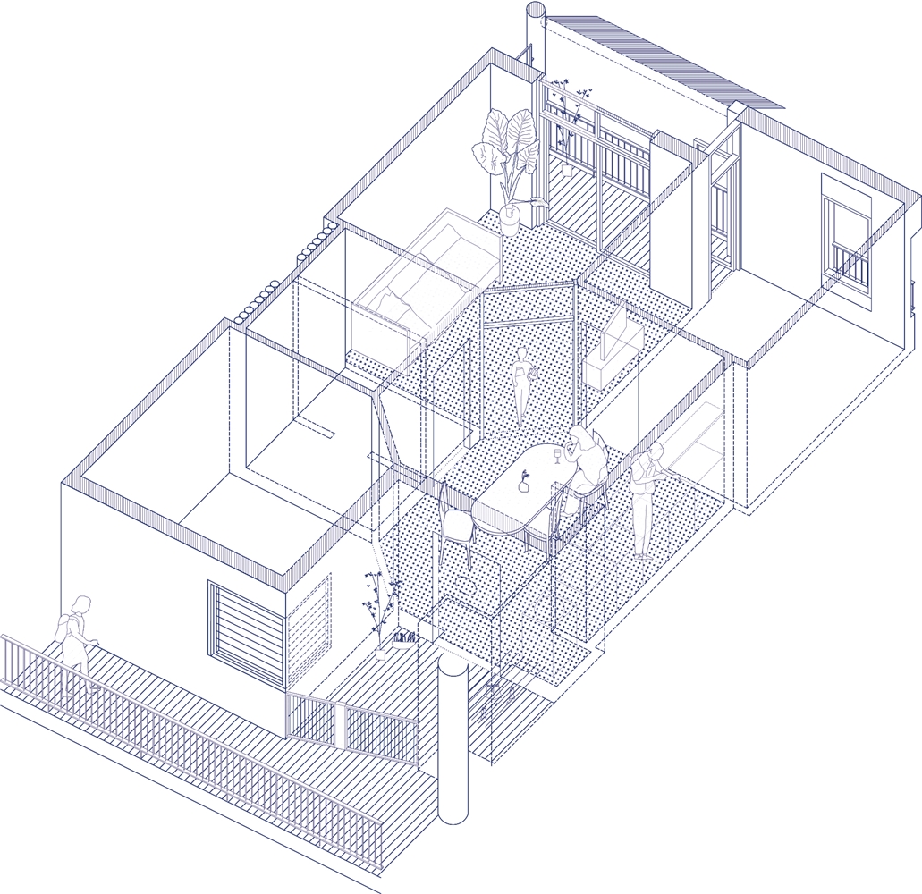 La estrategia de implantación consiste en ocupar el perímetro de la parcela para abrir un gran patio longitudinal comunitario. Esta decisión responde a la complejidad topográfica del entorno, con 3 niveles que delimitan la parcela. Desde C/Italia se accede en el patio interior a través de una rampa que sitúa la cota de las viviendas 80cm por encima de la calle. Éste se conecta verticalmente con la planta baja a través del núcleo de accesos. Finalmente, un porche en fachada gira en la esquina, relacionando la plaza con el nivel inferior de C/Domènech i Farré, ampliando la rampa preexistente.