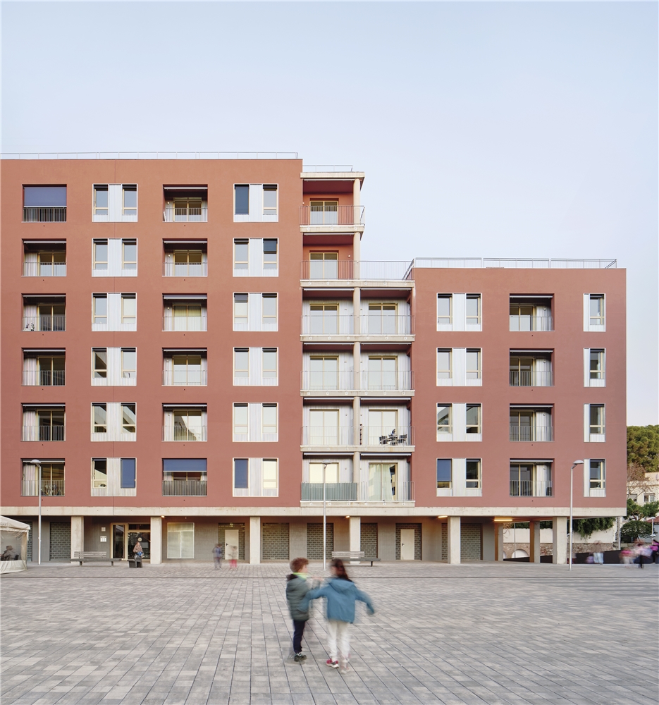 Conscientes de que el edificio construye la fachada más larga de la mencionada plaza, se trabaja una composición fragmentada mediante el tratamiento diferenciado de los balcones. Dos franjas verticales de balcones abiertos disgregan la homogeneidad de los huecos, consiguiendo una imagen más porosa. En planta baja, el ritmo horizontal del porche da continuidad a las conexiones urbanas entre cotas.