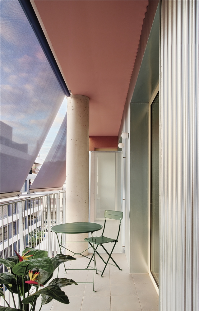 En las viviendas que componen el conjunto, se propone una tipología habitacional innovadora. El espacio de cocina conquista el corazón de la casa y se manifiesta como la pieza más social, ganando tamaño e importancia comparado con configuraciones clásicas. La disposición diagonal de los dormitorios les aporta independencia y rompe con los esquemas tradicionales de zona de día y zona de noche. Esta autonomía alcanza su clímax ya que las habitaciones disponen de acceso directo desde al espacio central mediante una gran abertura de doble puerta, favoreciendo la flexibilidad de uso. Cada vivienda disfruta de dos espacios exteriores. La cancela de acceso en pasarela, en contacto con el patio interior, proporciona intimidad y posibilita la ventilación sin riesgo de intrusismo. También ofrece un espacio de tender ventilado y protegido de las vistas. Por otro lado, el balcón en fachada volcado a la plaza.