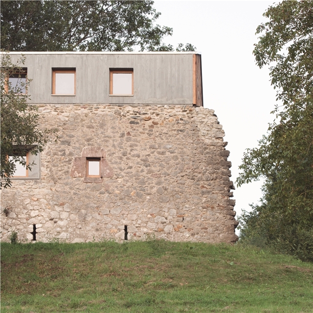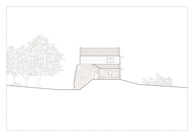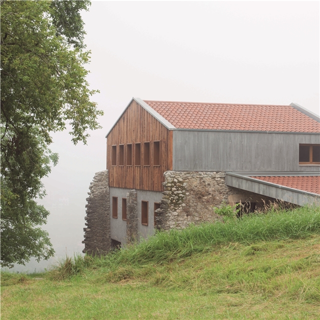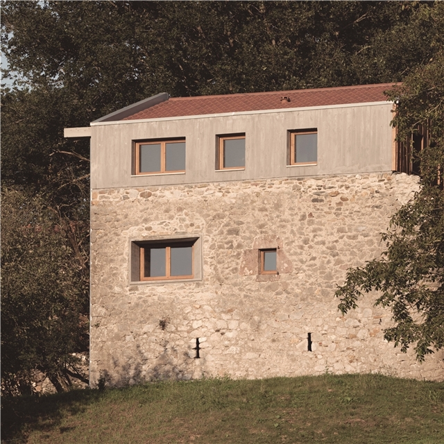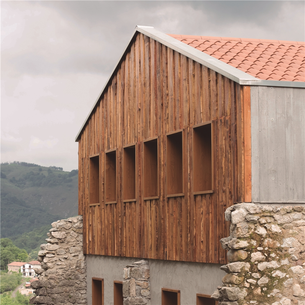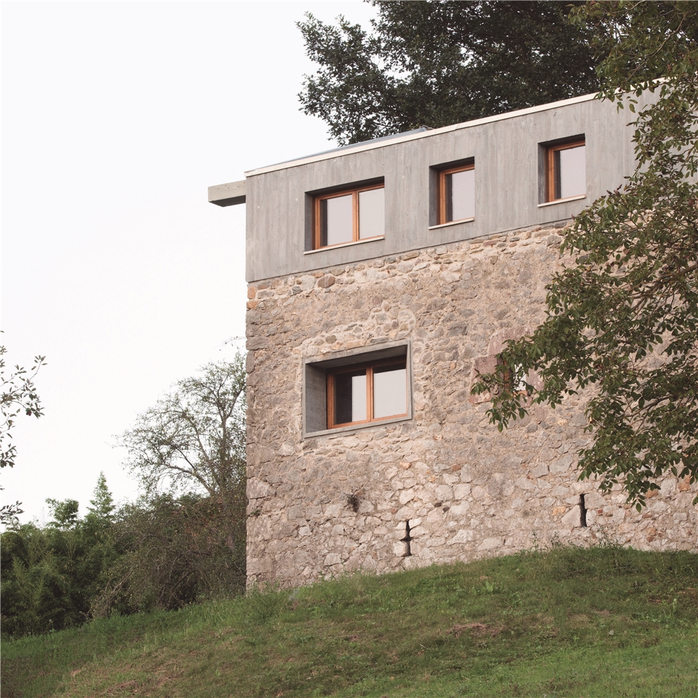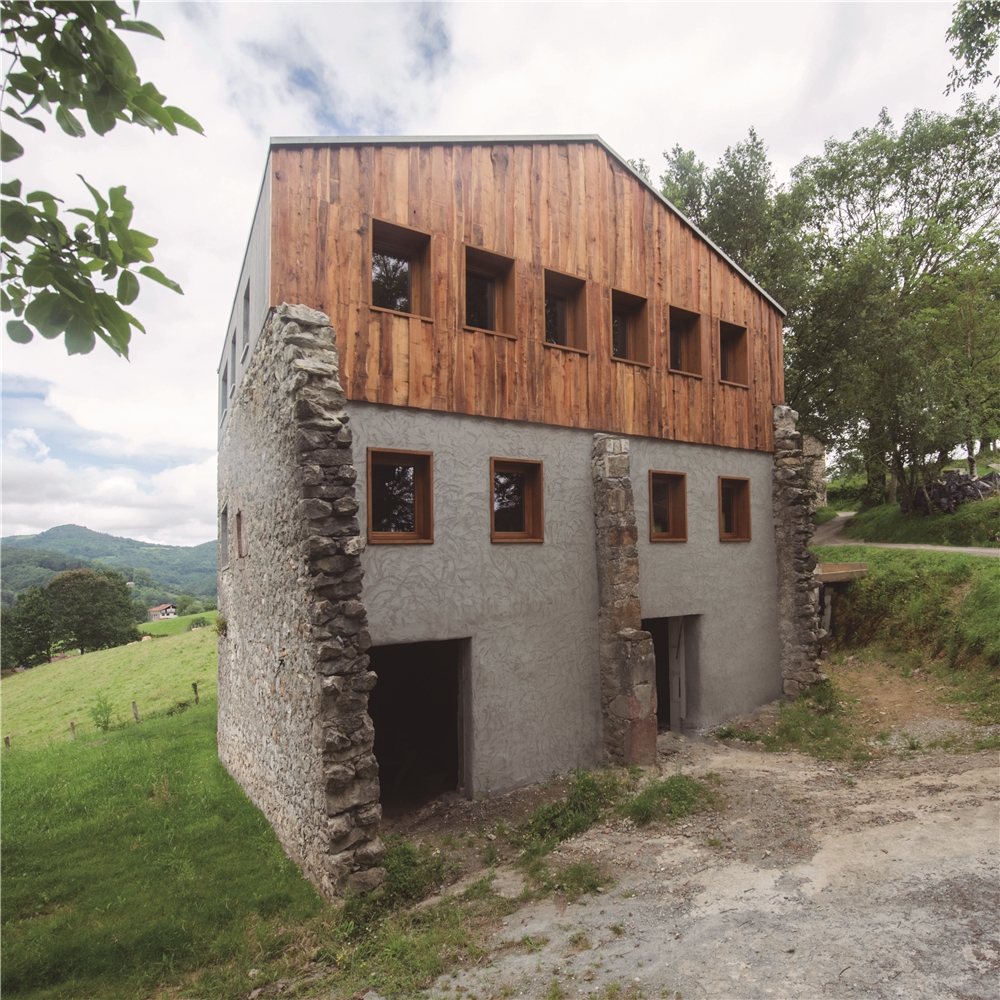 Debido a la escasa altura del desván para albergar los 3 dormitorios de los niños, sobre los muros de piedra perimetrales se ejecuta un zuncho/levante de hormigón armado (piedra líquida de nuestro tiempo). El hormigón tintado queda texturado a base de tablero vertical. Esta textura se convierte en madera de acacia reutilizada en la parte alta de la fachada sur, recordando el antiguo entramado de madera. La parte baja de esta fachada se reviste a base de mortero de cal texturado y las ventanas y puertas se construyen mediante madera de castaño. El levante de hormigón y la cubierta sin alero, debido a los importantes vientos de la zona, intensifican las condiciones de pesadez y torre del caserío.