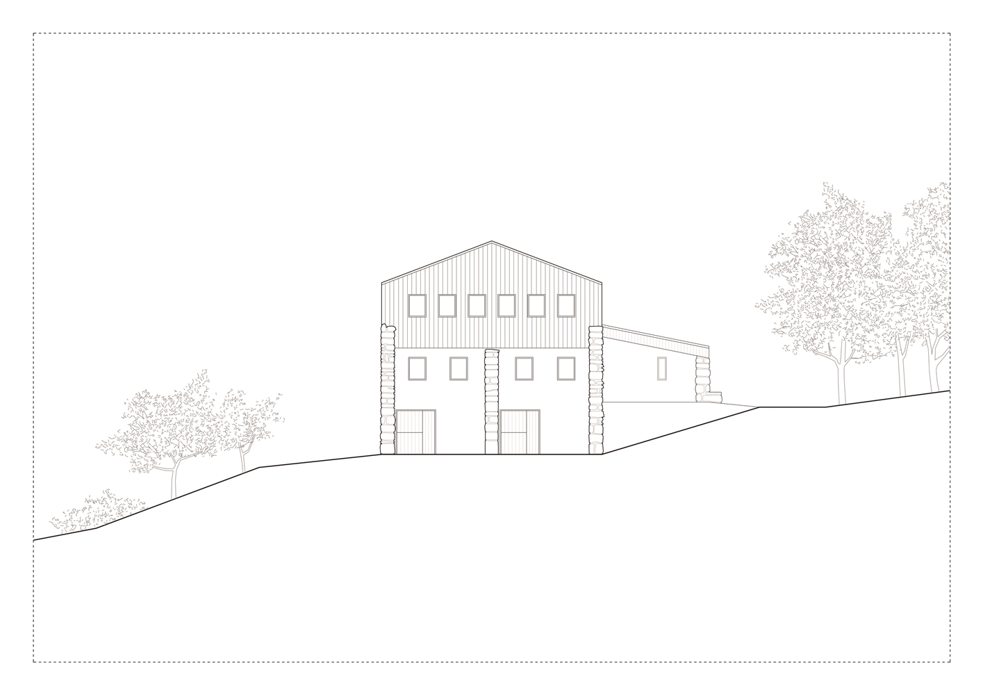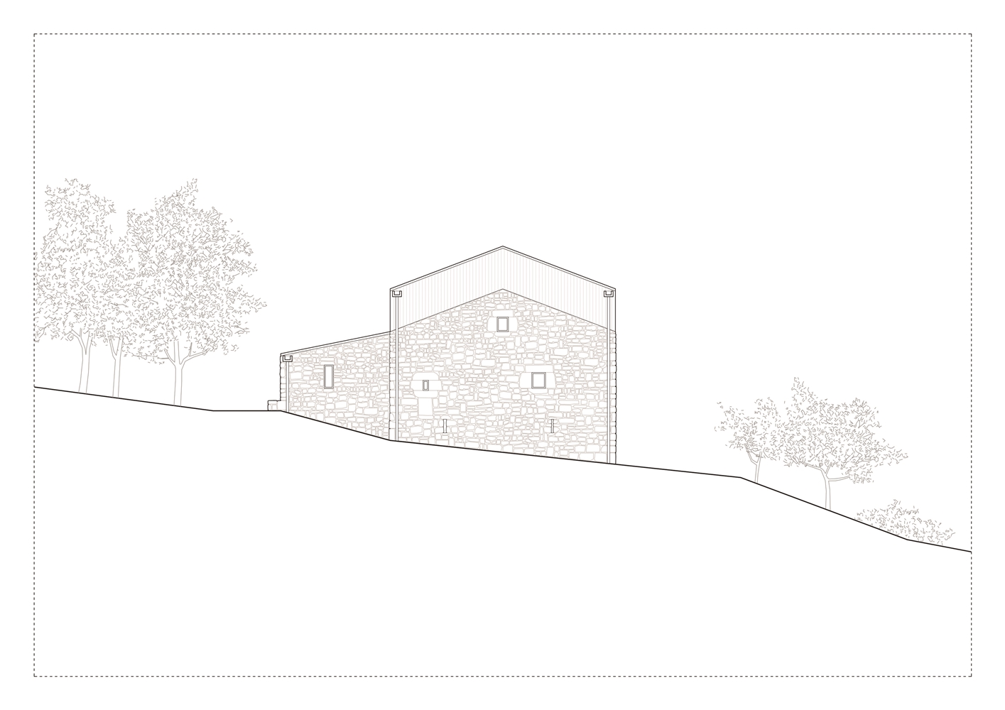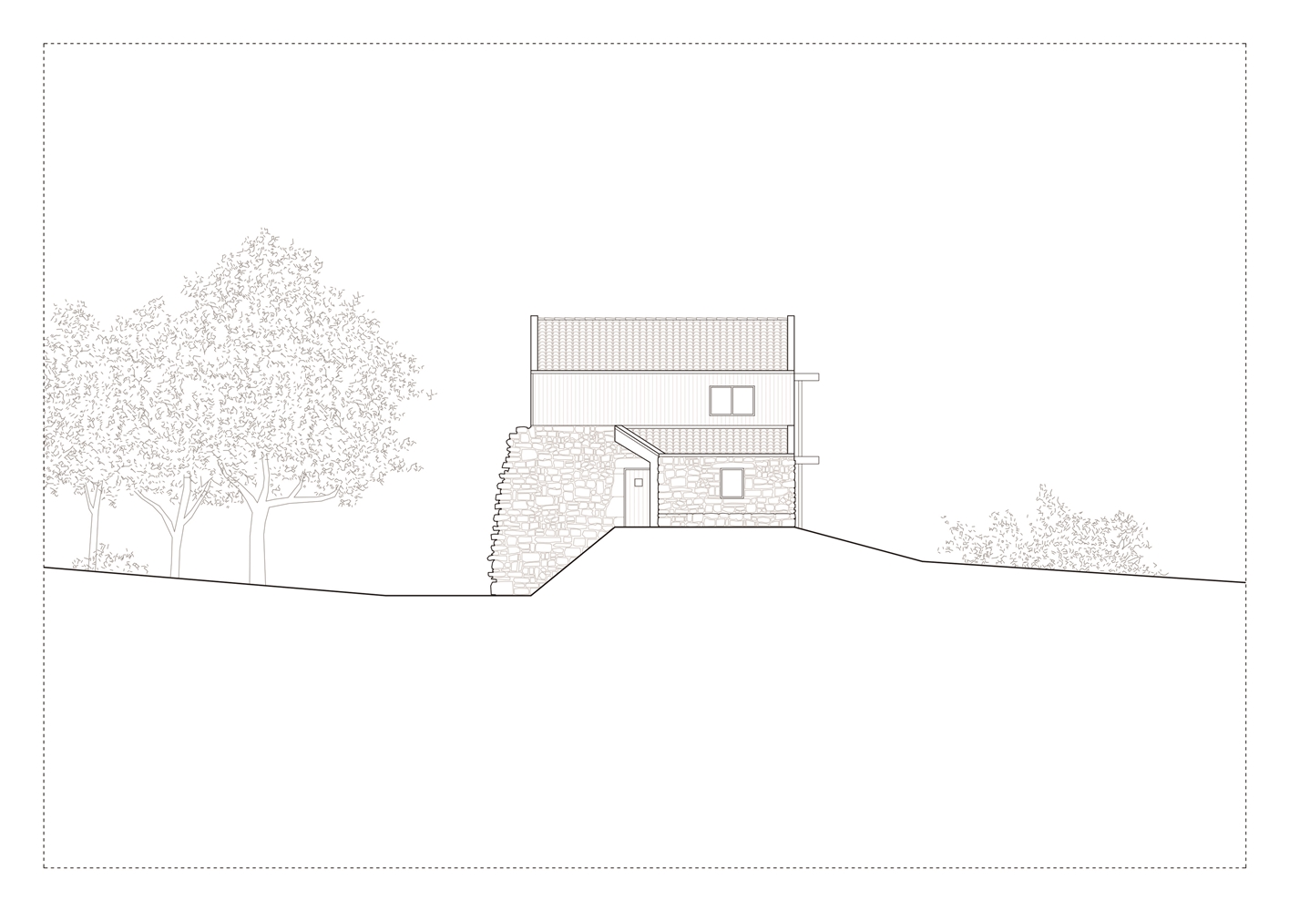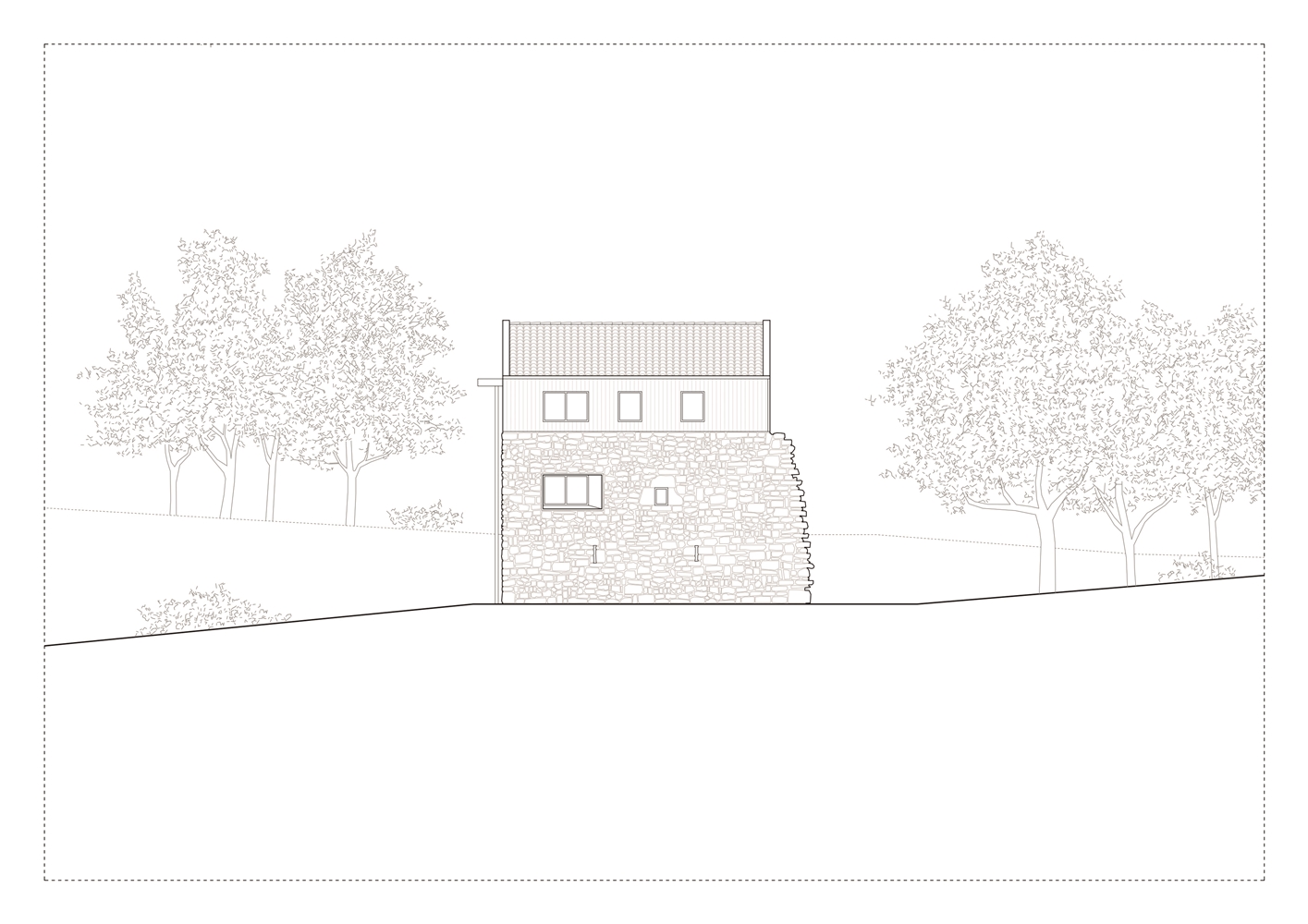 Debido a la escasa altura del desván para albergar los 3 dormitorios de los niños, sobre los muros de piedra perimetrales se ejecuta un zuncho/levante de hormigón armado (piedra líquida de nuestro tiempo). El hormigón tintado queda texturado a base de tablero vertical. Esta textura se convierte en madera de acacia reutilizada en la parte alta de la fachada sur, recordando el antiguo entramado de madera. La parte baja de esta fachada se reviste a base de mortero de cal texturado y las ventanas y puertas se construyen mediante madera de castaño. El levante de hormigón y la cubierta sin alero, debido a los importantes vientos de la zona, intensifican las condiciones de pesadez y torre del caserío.
