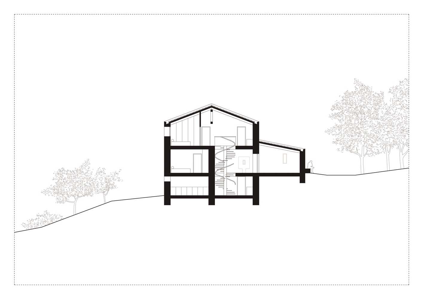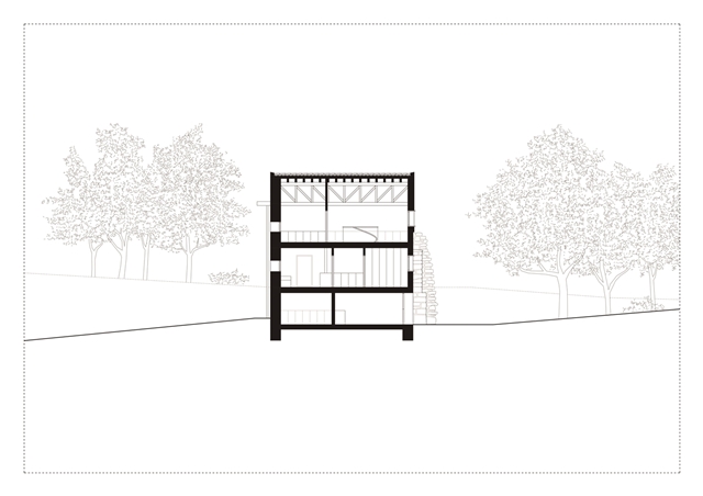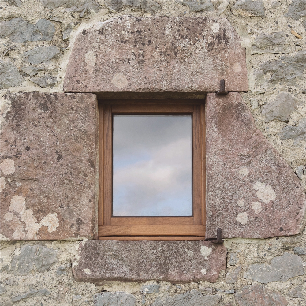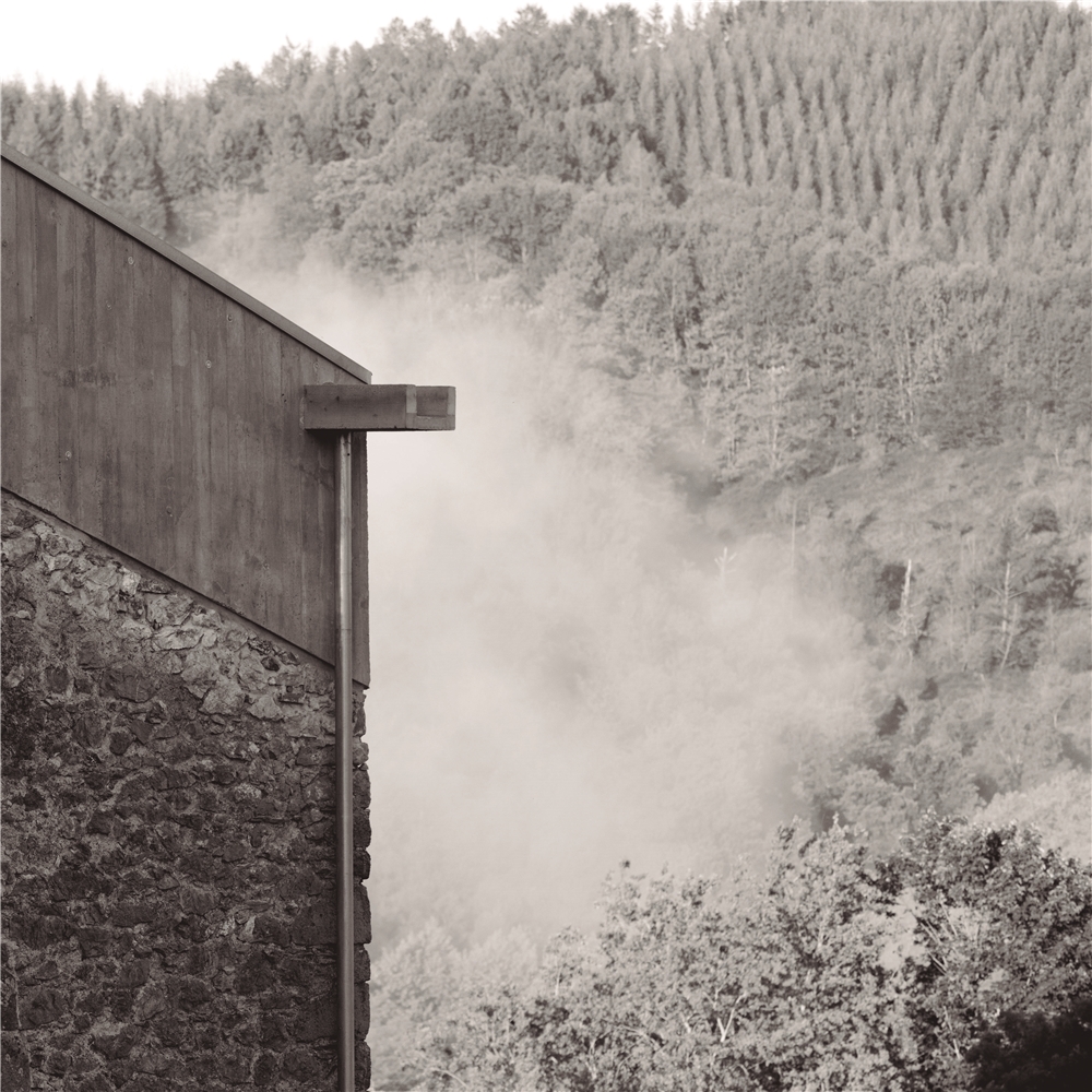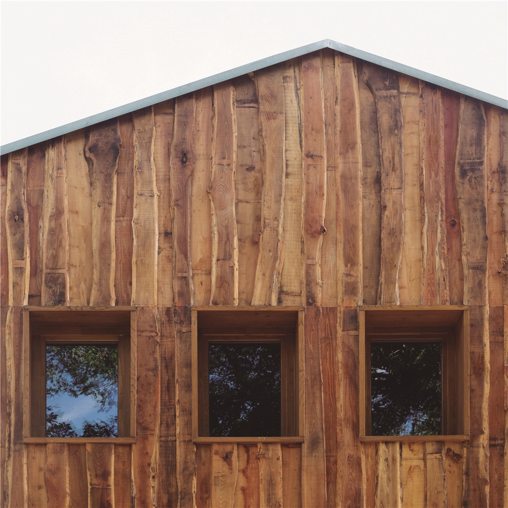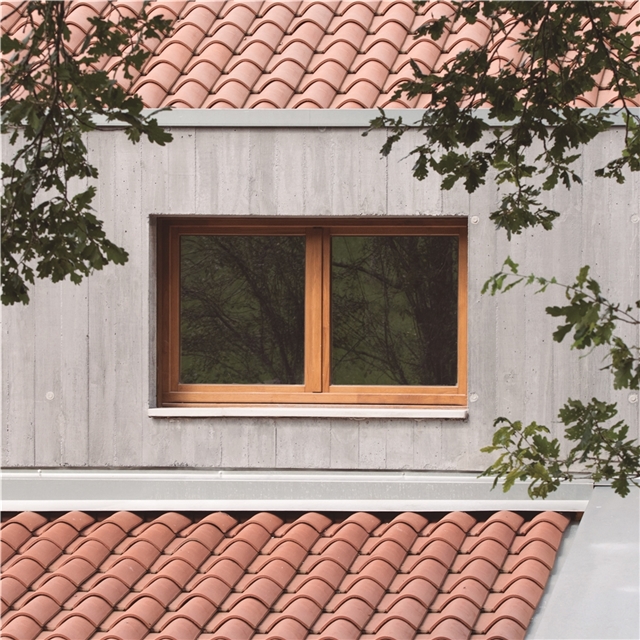 Debido a la escasa altura del desván para albergar los 3 dormitorios de los niños, sobre los muros de piedra perimetrales se ejecuta un zuncho/levante de hormigón armado (piedra líquida de nuestro tiempo). El hormigón tintado queda texturado a base de tablero vertical. Esta textura se convierte en madera de acacia reutilizada en la parte alta de la fachada sur, recordando el antiguo entramado de madera. La parte baja de esta fachada se reviste a base de mortero de cal texturado y las ventanas y puertas se construyen mediante madera de castaño. El levante de hormigón y la cubierta sin alero, debido a los importantes vientos de la zona, intensifican las condiciones de pesadez y torre del caserío.