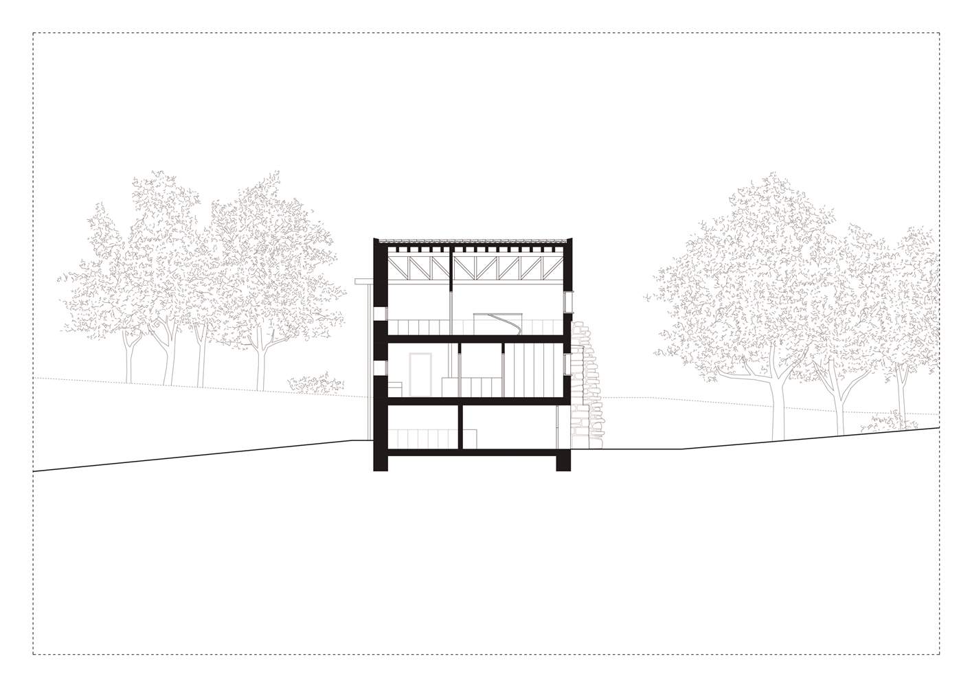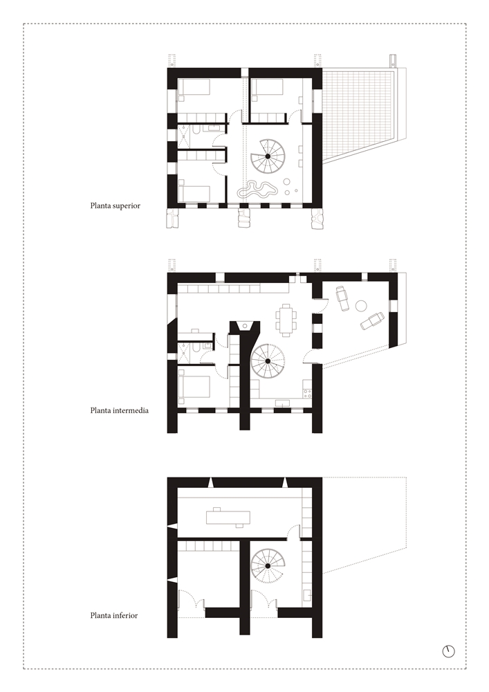 La planta baja, donde antiguamente se encontraba la cuadra, alberga ahora la despensa, conectando la huerta del sur con la cocina mediante una escalera circular. En la planta intermedia se encuentran el dormitorio principal y la zona de día, con acceso a nivel desde el este. El muro de mampostería central preexistente se utiliza como apoyo estructural de los nuevos forjados de losa de hormigón, que permiten arriostrar los desplomados muros perimetrales. En torno al muro central se localizan la cocina, la escalera, la chimenea y el almacenaje. Esta planta continua recibe luz desde el sur y se abre mediante un hueco abocinado (que introduce en la sala los primeros rayos de luz del mediodía) hacia el oeste, ofreciendo visiones del macizo Peñas de Aia.