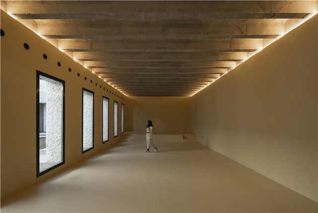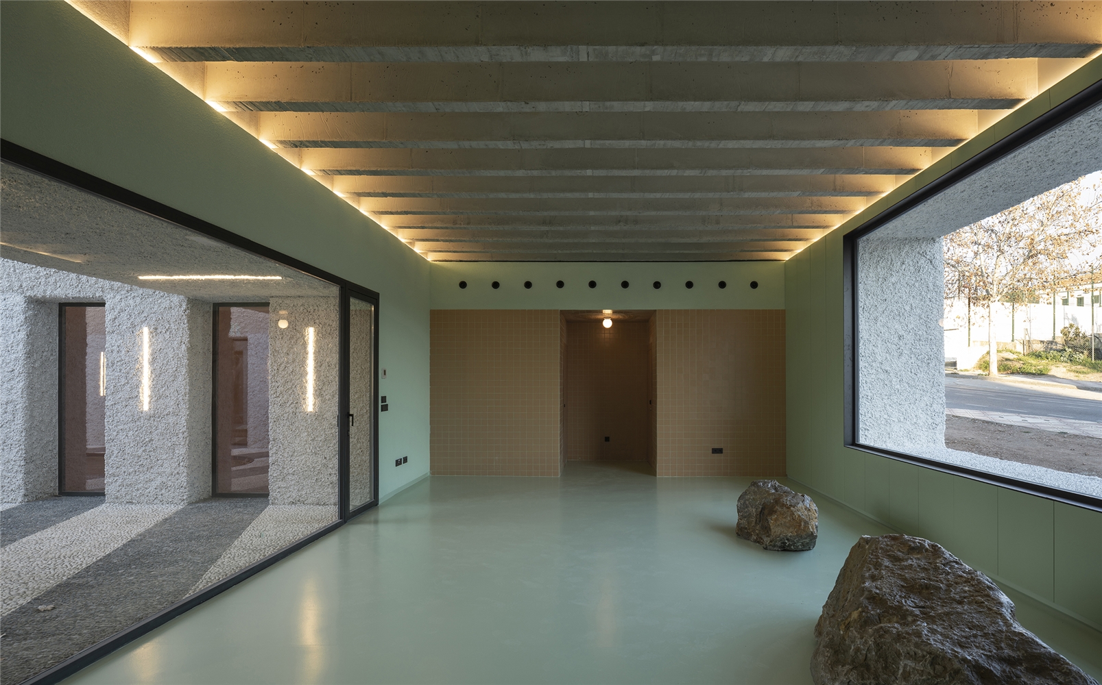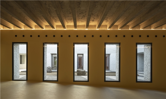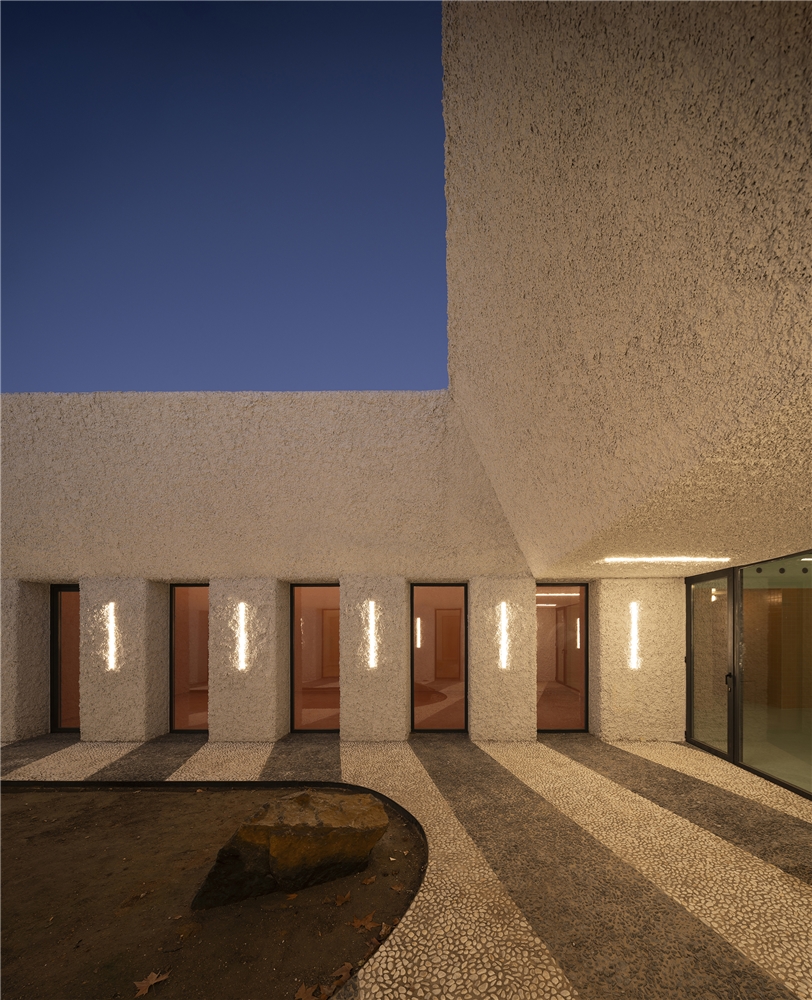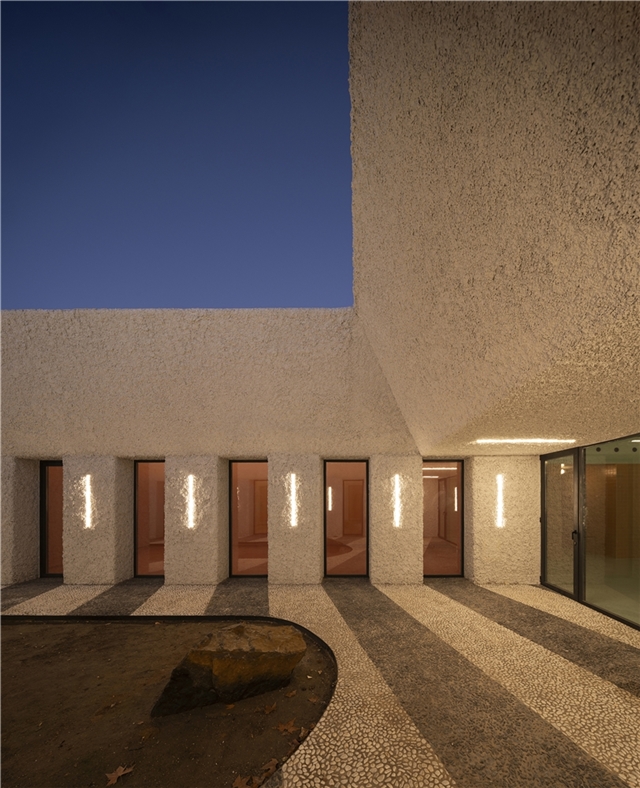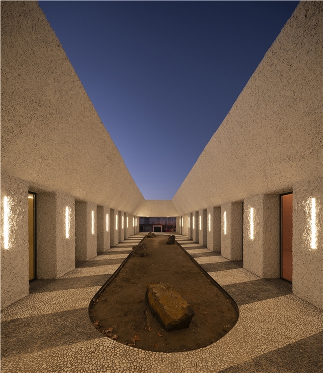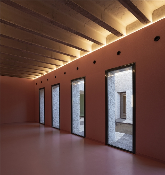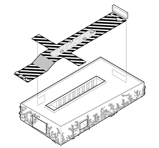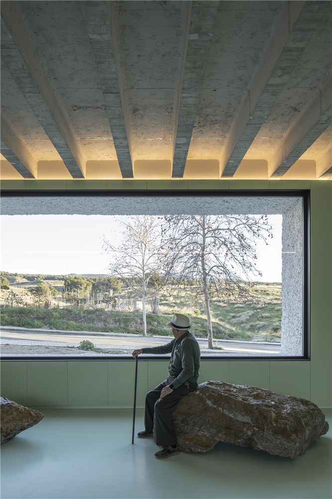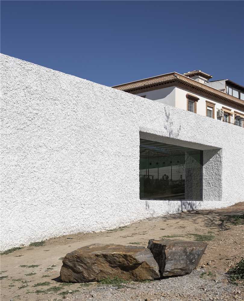 Una arquitectura con vocación atemporal, por su formalidad y su materialidad, alejada de convencionalismos contemporáneos con objeto de recuperar los modos constructivos tradicionales, donde prevalece la técnica manual y no la industrial; donde se construye con la memoria y no con la moda. Como el onírico Danteum[1] de Giuseppe Terragni, el edificio se encierra en sí mismo, discrimina su exterior para buscar la contemplación y la reunión social, contrastando su piel austera y silenciosa con su interior colorido y dialogante. La materialidad se muestra a través de una dualidad primigenia como es la piedra y el tiempo. Desde la gravilla, al canto rodado; de la laja hasta la roca. Siendo el suelo que caminamos, el techo que habitamos y el asiento en donde descansamos. Por último, el tiempo y su discurrir continuo darán testimonio del paso de las estaciones con una vegetación que cubrirá por completo la piel exterior y tornará de verde a rojo y la nada. Y así siempre.