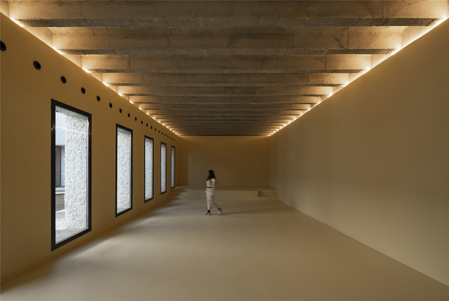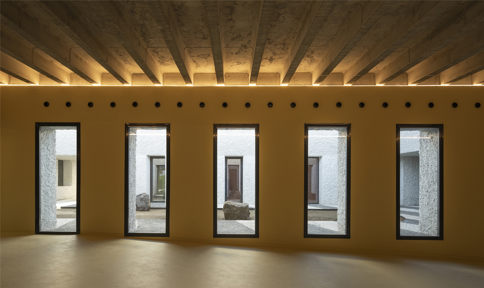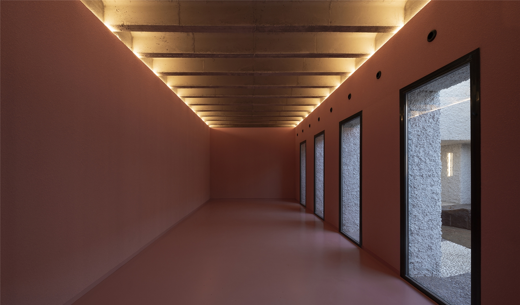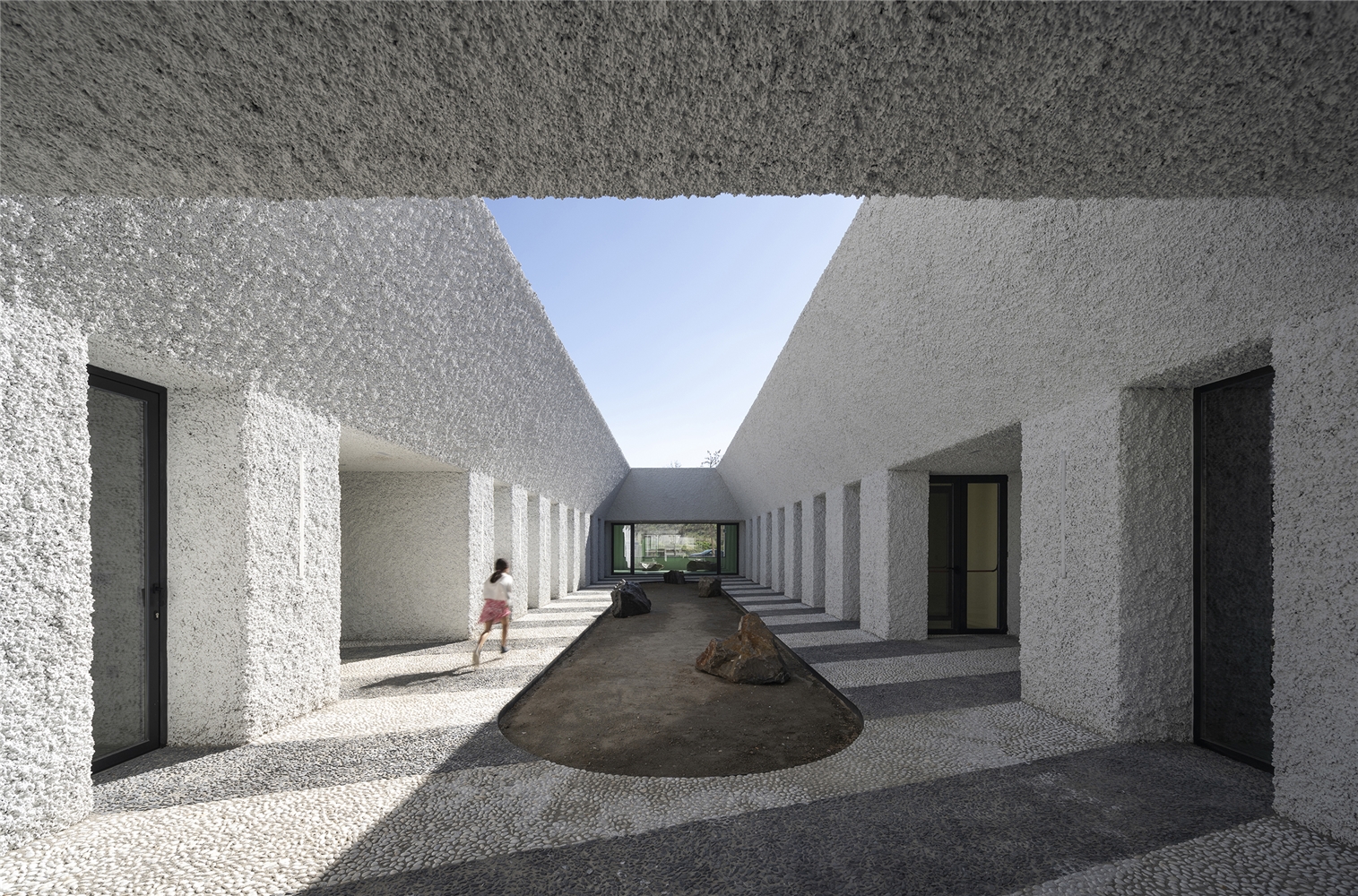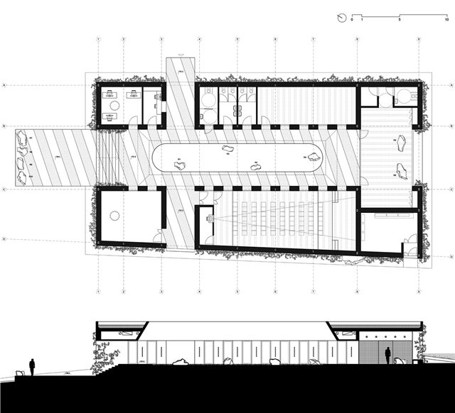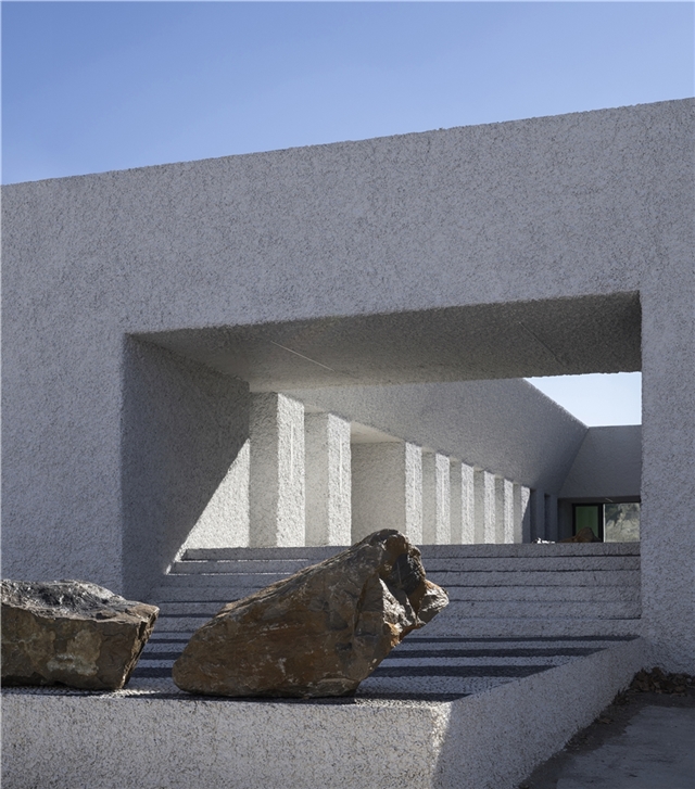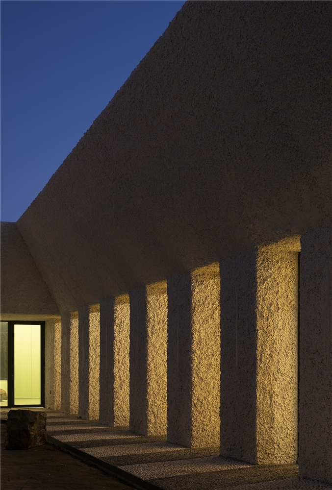 Una arquitectura con vocación atemporal, por su formalidad y su materialidad, alejada de convencionalismos contemporáneos con objeto de recuperar los modos constructivos tradicionales, donde prevalece la técnica manual y no la industrial; donde se construye con la memoria y no con la moda. Como el onírico Danteum[1] de Giuseppe Terragni, el edificio se encierra en sí mismo, discrimina su exterior para buscar la contemplación y la reunión social, contrastando su piel austera y silenciosa con su interior colorido y dialogante. La materialidad se muestra a través de una dualidad primigenia como es la piedra y el tiempo. Desde la gravilla, al canto rodado; de la laja hasta la roca. Siendo el suelo que caminamos, el techo que habitamos y el asiento en donde descansamos. Por último, el tiempo y su discurrir continuo darán testimonio del paso de las estaciones con una vegetación que cubrirá por completo la piel exterior y tornará de verde a rojo y la nada. Y así siempre.
