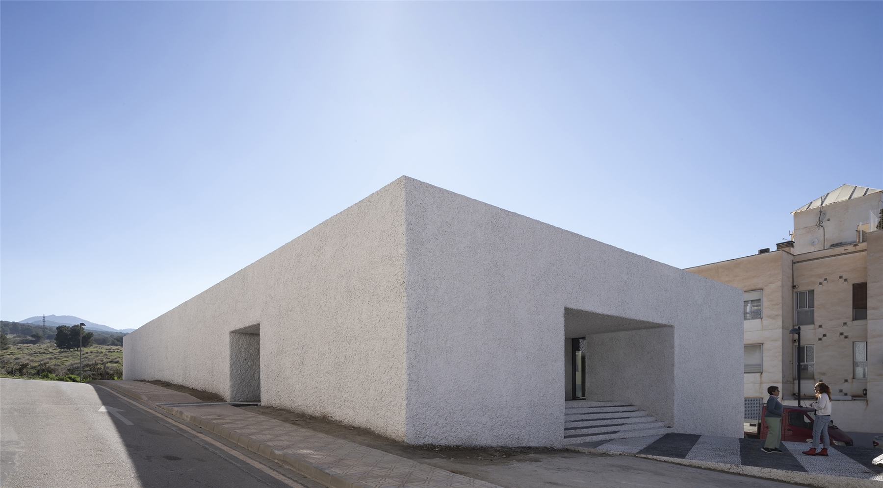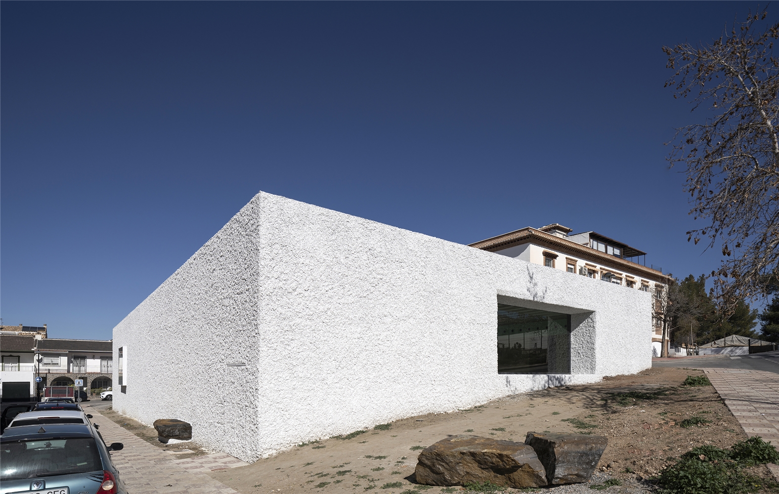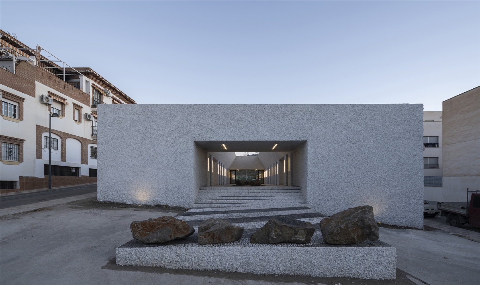 La parcela objeto de intervención se encuentra en el barrio conocido como “La Cañada de los Priscos” en el borde exterior del casco urbano de La Zubia limítrofe con el Parque Natural de Sierra Nevada en su extremo sur y próximo al término municipal de Cájar. Consta de 1.225 m², con un desnivel transversal este-oeste de 2.50 metros y longitudinal de 4 metros. Previo a la intervención este ámbito urbano estaba destinado a bolsa de aparcamientos en un barrio con una deficiencia generalizada de dotación de equipamiento público que ha llevado a una situación marginal y de inseguridad entre sus vecinos, donde altercados y delincuencia han marcado la convivencia de los últimos años. Y es esta una de las motivaciones fundamentales de proyecto: hacer una arquitectura capaz de regenerar espacios urbanos degradados que mejoren su integración en el conjunto y revitalice las relaciones sociales de la comunidad.