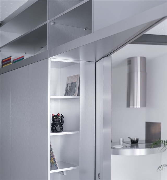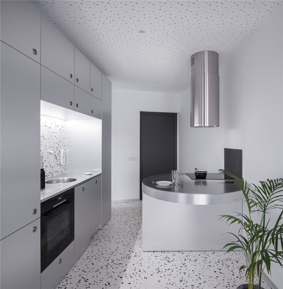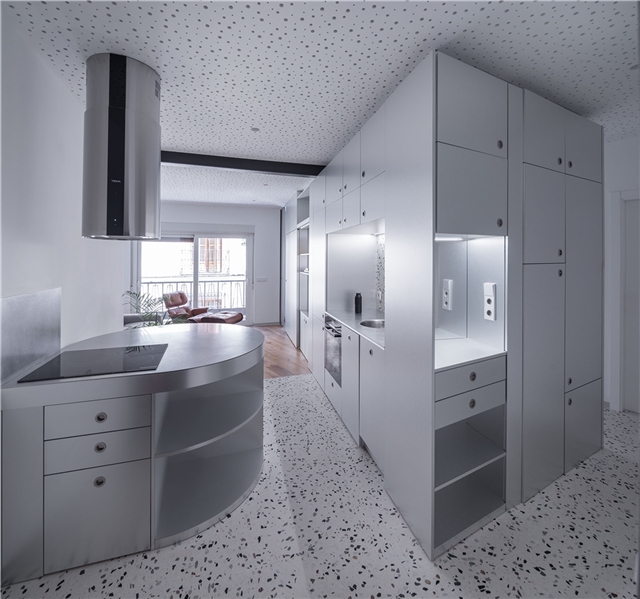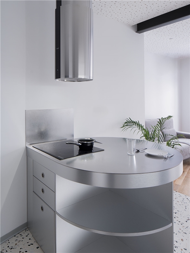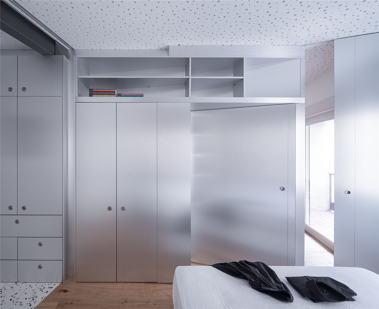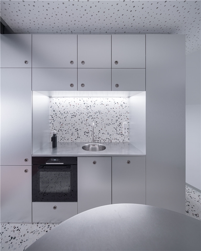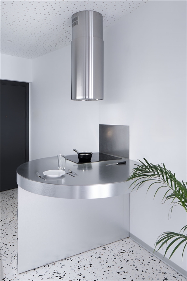 La heterogeneidad de infraestructuras que la pieza condensa se equilibra con una homogeneidad casi genérica de su acabado: aluminio cepillado. Tan sólo las dos encimeras se resuelven con piezas continuas de acero inoxidable reciclado debido a su resistencia frente a un uso agresivo.