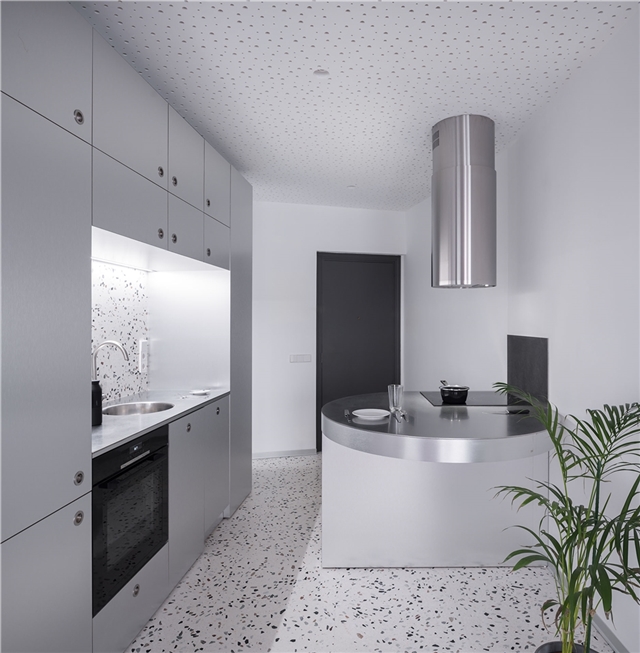 La única pieza segregada del prisma triangular central es una isla de geometría circular, que funciona como elemento de cocina, almacenaje y mesa de comedor.