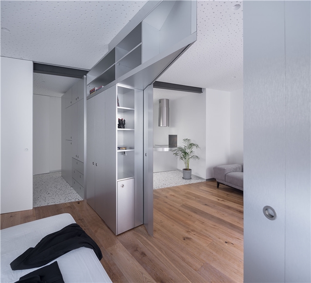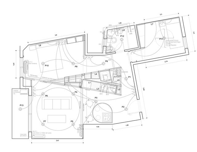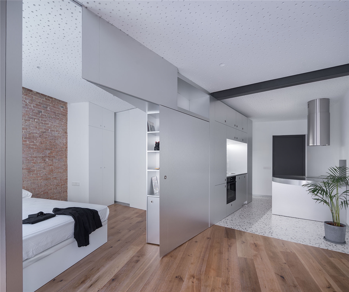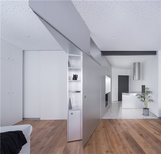 El plano de techo se resuelve con la misma condición de abstracción homogénea que el resto del apartamento, usando un techo acústico perforado que incorpora a modo de otros orificios las luminarias empotradas orientables que se distribuyen homogéneamente según los posibles requisitos de usos multiples del espacio inferior a él.