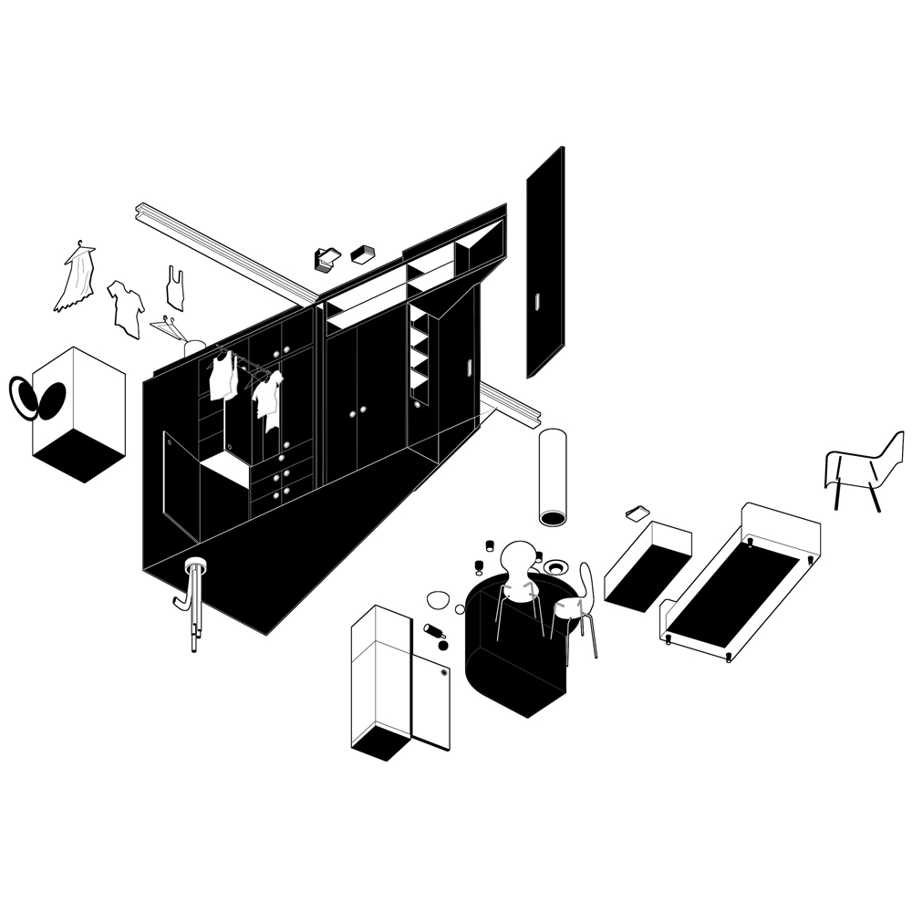 La reinvención de las prácticas del día a día, heredadas, asumidas e impuestas, se antoja como una de las pocas formas de revolución social posibles en la era del post-capitalismo. El diseño de nuevos formatos arquitectónicos que planteen marcos contextuales, lugares de oportunidad, fuera de las restricciones de la domesticidad heredadas de la modernidad es crucial para la posible reinvención de la vida cotidiana. La pieza que aquí se inserta en una vivienda convencional pretende reorganizar su eventualidad doméstica en torno a un Dispositivo para la Crítica de la Vida Cotidiana, en la línea de lo apuntado por Henri Lefebvre.