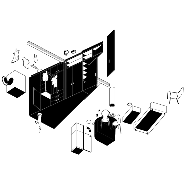 La operación arquitectónica es puramente estratégica. Se plantea una abstracción tipológica de la planta de una vivienda convencional mediante la implantación de un elemento puramente geométrico que contiene todos los mecanismos, instalaciones y objetos y necesarios para construir la esfera de lo doméstico. Un dispositivo arquitectónico que congrega, pliega y despliega eventos domésticos.