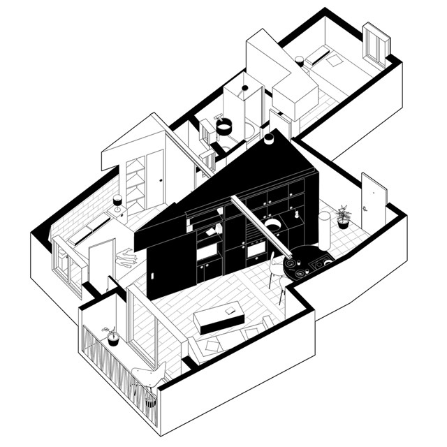 La domesticidad se reduce a pura infraestructura. Los diferentes programas cotidianos, derivados de las necesidades de la propietaria, quedan embebidos en una pieza de mobiliario triangular que asume el rol infraestructural del proyecto.