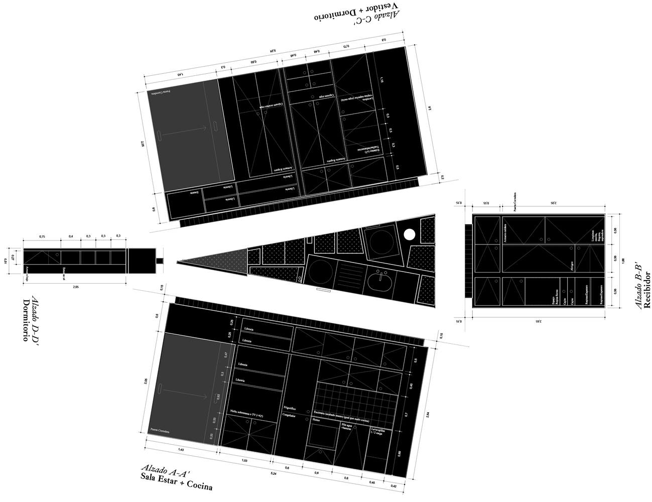 La infraestructura doméstica, prisionera de la geometría triangular, es un oxímoron arquitectónico que emancipa las rutinas del día a día generando líneas de fuga de la cotidianeidad.