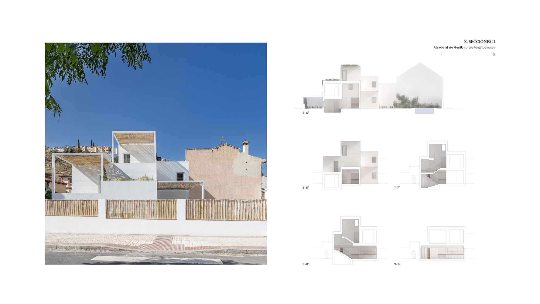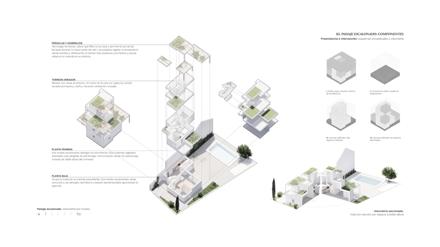 TERRITORIO. La vivienda se sitúa junto al río Genil, en una posición privilegiada entre dos promontorios. Construye su propia topografía mediante bancales habitados que escalonan el programa en siete niveles: del semisótano al mirador. Cada nivel mantiene su relación íntima con el paisaje; el jardín rodea la casa escalonándose en terrazas vegetales.