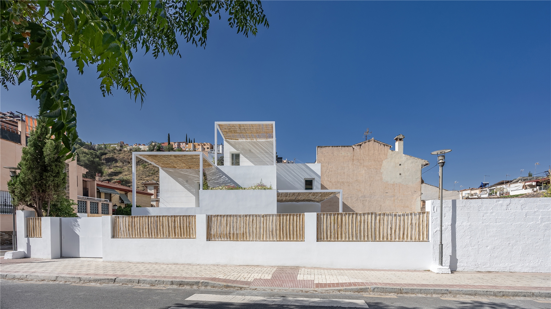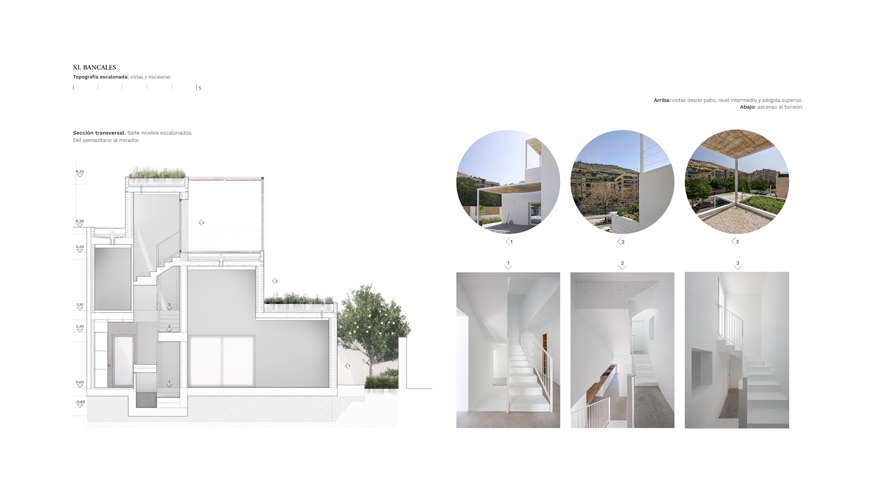 BANCALES. Cada nivel genera su relación propia con el entorno. Cada terraza y su pérgola asociada ofrecen un grado distinto de intimidad y apertura. La casa como mirador habitado: una secuencia de espacios que gradúan la experiencia desde lo más privado del hogar hasta la contemplación panorámica. El derecho al paisaje como conquista doméstica.