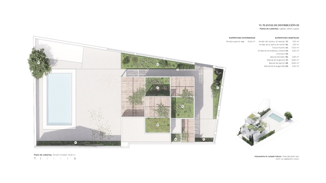 EL JARDÍN POR VENIR. La casa se concibe como arquitectura que evolucionará. Mejorará gracias a la vegetación. Las cubiertas recibirán plantaciones que completarán un jardín por fases, según las posibilidades económicas, la dedicación de los propietarios y las estaciones. Bancales de aromáticas, carnosas y trepadoras transformarán las terrazas en jardines colgantes. O eso espera quien lo pensó...