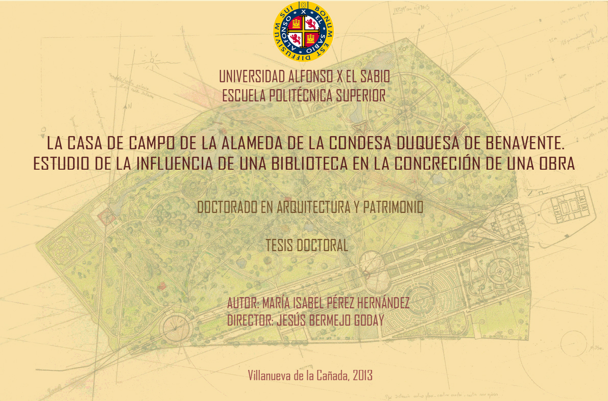 El objetivo propuesto con esta investigación es el estudio de la generación de una Casa de campo a través de una biblioteca, analizando las relaciones de causa-efecto existentes entre determinadas imágenes y textos de los libros de la biblioteca que poseyeron los IX duques de Osuna con el diseño del jardín, construcciones y posesión en su conjunto, a la que denomino Casa de campo de la Alameda, por tanto el entendimiento del contenido de la biblioteca como una herramienta de proyecto de la voluntad de creación de una obra.