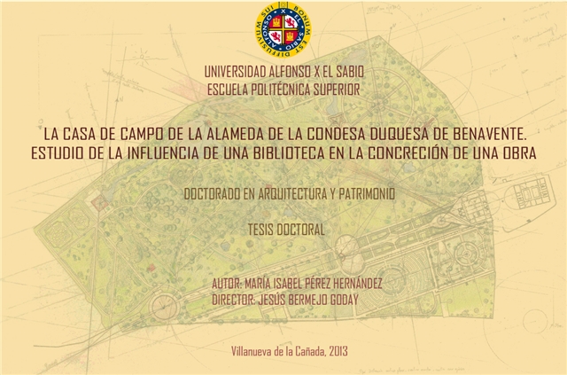 The purpose of this research is the study of the development of a country house through its library, analyzing the cause-effect relationships existing between certain images and texts of the books of the library owned by the IX Dukes of Osuna, with garden design, buildings and estate as a whole, that I refer to as the Country House of Alameda, therefore the contents of the library should be understood as a tool to carry out the project of creating a work of art.