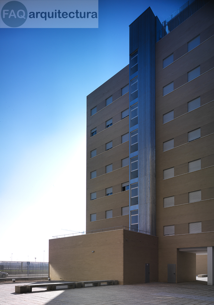 El edificio permite reconocer con facilidad su volumetría. Básicamente se compone de un cuerpo de cuatro plantas y tres de ocho ortogonales y apoyados en él. El de cuatro plantas, alineado a la calle peatonal, expresa su forma lineal y unitaria a pesar de la aparente fragmentación, gracias a la visión que le permiten los puentes desde la zona pública exterior. Los locales comerciales y dos aparcamientos destinados a minusválidos, situados bajo los puentes, en la zona Sur-Este, dejan entender que son los puntos de apoyo de los puentes. El cerramiento exterior de la parcela, entre bloques, en ese frente, se retranquea hasta la fachada posterior de los locales. Se logran así unos espacios de estancia cercanos a los locales que ayudarán a su valoración como piezas públicas, donde se sitúan los dos accesos peatonales al edificio y el del servicio de extinción de incendios, ya que las cajas de escaleras dan siempre al interior del espacio vívidero privado. En el lindero Noreste, el enfrentado a la zona pública exterior, el cerramiento une la zona cubierta de la rampa de aparcamientos con la edificación del bloque de cuatro plantas, que en ese vértice llega a agotar las ocho plantas.
