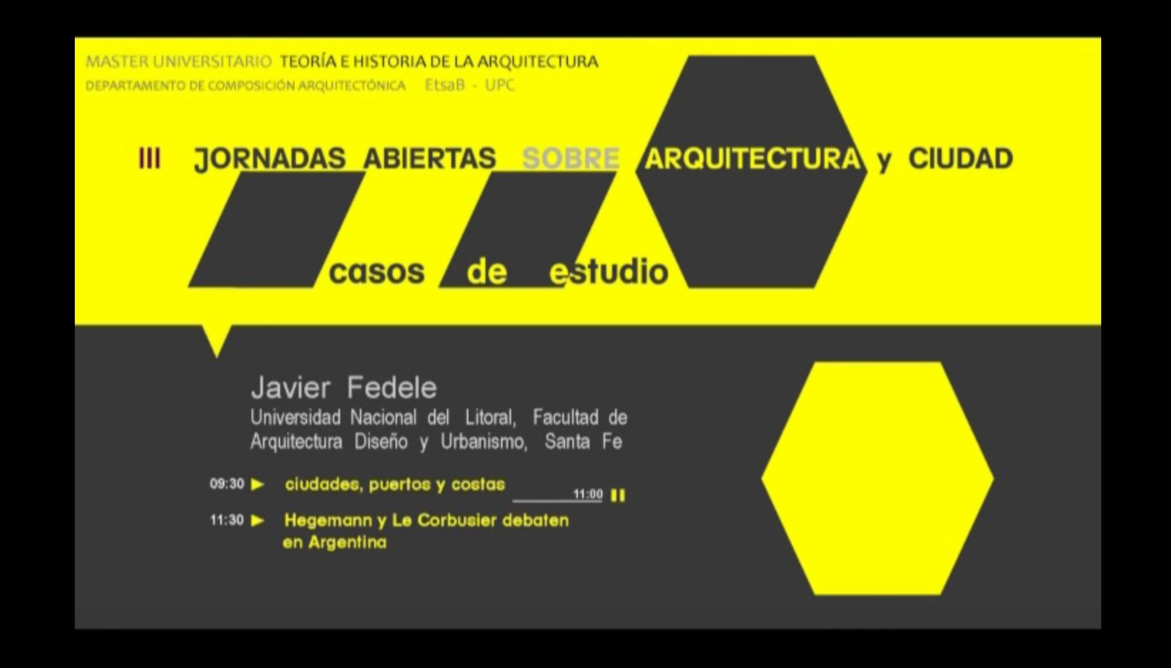 Sinopsis: Conferència de Javier Fedele, professor de la Facultad de Arquitectura Diseño y Urbanismo de la Universidad Nacional de Litoral de Santa Fé (Argentina), presentat per Manuel Guardia, professor del Departament de Composició Arquitectònica de l'ESTAB. 2099.2/2489