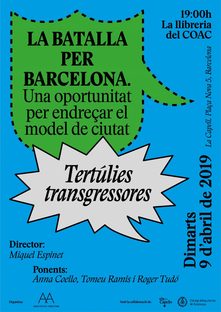 Tertúlies transgressores es un ciclo de tertulias dedicado a abordar temas de actualidad, ciudad y arquitectura con un trasfondo polémico, pero de alto interés para el ciudadano y los profesionales de la materia. Esta edición aprovecha las consultas electorales del momento: La batalla por Barcelona, ​​una oportunidad para ordenar el modelo de ciudad.